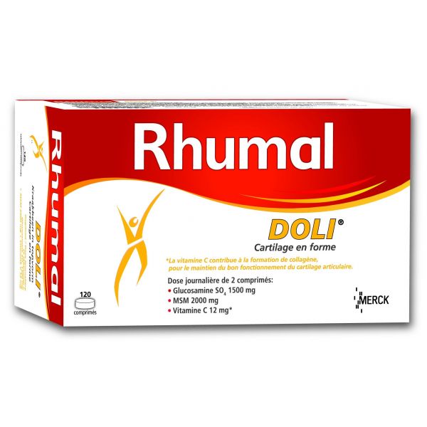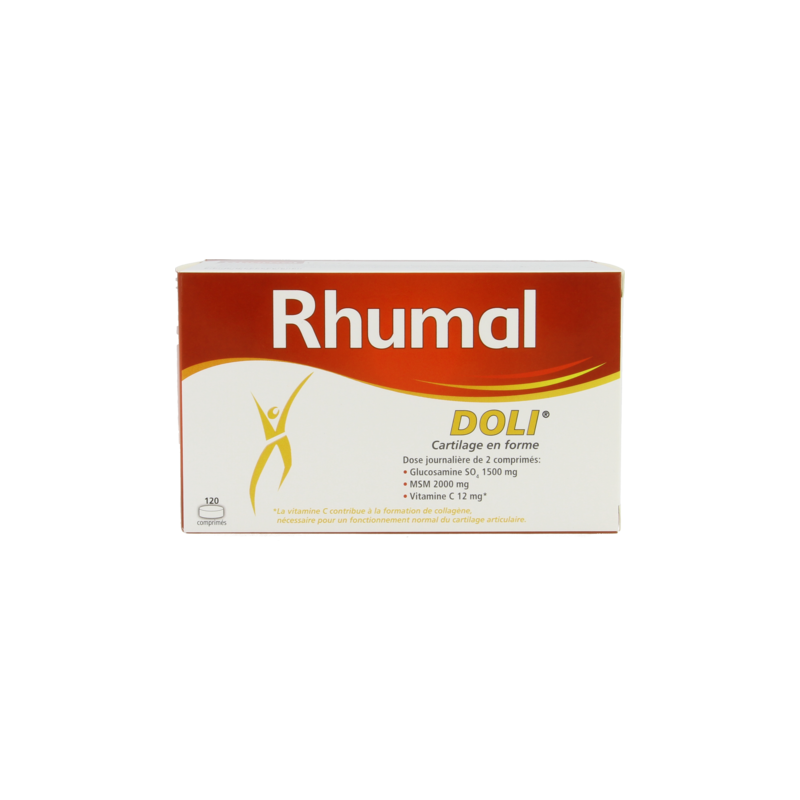 • Compositie : Rhumal Doli is een kwalitatief hoogstaand voedingssupplement dat per 2 tabletten 1500mgzuivere, kristallijne glucosaminesulfaat, 2000 mg MSM en 12 mg vitamine C (15% ADH*) bevat. *ADH = Aanbevolen Dagelijkse Hoeveelheid. Ingrediënten : Methylsulfonylmethaan; Kristallijne glucosaminesulfaat; Vulmiddel: Microkristallijne cellulose; Bindmiddel : Polyvinylpyrrolidone ; Antiklontermiddelen: Magnesiumstearaat, Talk; Glansmiddel: Hydroxypropylmethylcellulose; Bijenwas; Kleurstoffen: Titaandioxide, Geel ijzeroxide; Ascorbinezuur; Bevochtigingsmiddel: Polysorbaat 80. Bevat afgeleide producten van krabschalen. Niet geven aan personen met een gekende overgevoeligheid.