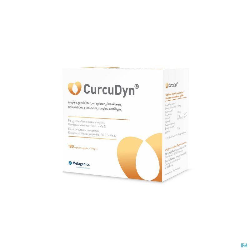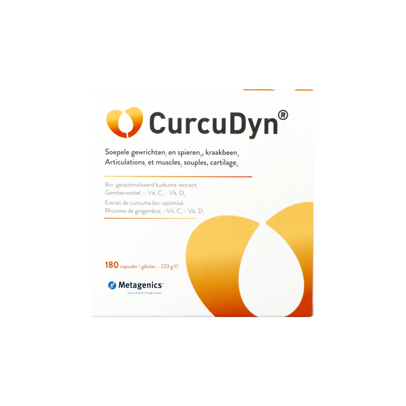CurcuDyn® bevat een kurkuma-extract en gemberextracten die bijdragen tot het behoud van soepele gewrichten. CurcuDyn® bevat ook vitamine D die bijdraagt tot de instandhouding van de normale werking van de spieren, en vitamine C die bijdraagt tot de normale collageenvorming voor de normale werking van het kraakbeen en van de bloedvaten.