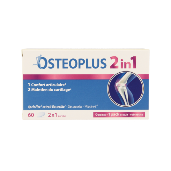 Osteoplus is voor mensen die vrij willen blijven bewegen, zeker in geval van gewrichtsaandoeningen. Vanaf de leeftijd van 45 jaar ondervinden veel mensen dat bewegen soms minder vlot gaat. Om soepel te blijven bewegen is het belangrijk dat we onze gewrichten & kraakbeen gezond houden. Dit doet Osteoplus met een gamma producten die de gewrichten in goede conditie helpen houden. Osteoplus 2in1, een unieke combinatie van AprèsFlex® Boswellia Extract, glucosamine & vitamine C, is de ideale startkuur. Dankzij zijn dubbele werking, biedt het:1. Gewrichtscomfort en beweeglijkheid in 7 dagen dankzij AprèsFlex® Boswellia Extract en 2. Het behoud van gezond kraakbeen dankzij vitamine C* . AprèsFlex® Boswellia Extract is een gepatenteerd extract en bevat een hoge concentratie van het Boswelliazuur AKBA. Door zijn unieke samenstelling, biedt het een verhoogde biodisponibiliteit, wat ervoor zorgt dat er meer door uw lichaam opgenomen wordt. Bovendien heeft het een wetenschappelijk bewezen doeltreffendheid**. Beschikbaar in pack van 1 maand. Ontdek ook het nieuw spaarprogramma op de bijsluiter. * Dankzij Vitamine C dat bijdraagt tot de normale collageenvorming voor de normale werking van het kraakbeen. ** Dubbel blinde, gerandomiseerde, placebo gecontroleerde klinische studie. Sengupta et al., 2010
