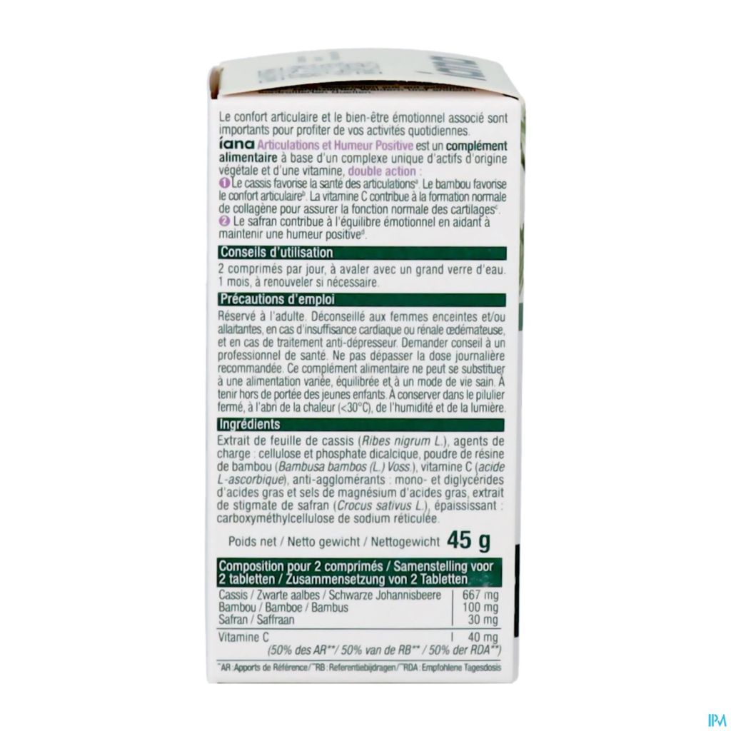 Zwarte aalbes (667 mg) ondersteunt de gezondheid van de gewrichten, terwijl vitamine C (40 mg) bijdraagt aan de normale vorming van collageen voor een normale kraakbeenfunctie. Bamboe (100 mg) bevordert het gewrichtscomfort en saffraan (30 mg) draagt bij aan het mentaal evenwicht door een positieve stemming te helpen behouden.