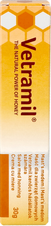 Vetramil honingzalf bevat enzymrijke honing die de huid zuivert en het herstel van de huid ondersteunt. De honing versnelt het herstel en is gunstig voor de beschadigde huid. Daarnaast bevat Vetramil honingzalf essentiële oliën met gunstige eigenschappen voor huidgerelateerde problemen die bijdragen aan een prettig gebruik. De lage pH waarde (zuurgraad) van Vetramil honingzalf ondersteunt de conditie en natuurlijke weerstand van de huid.