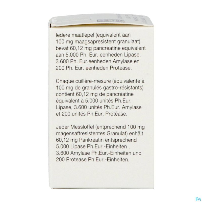Elke lepel bevat 100 mg minimicrosferen. Deze bevat 60,12 mg pancreatine overeenstemmend met (Ph.Eur. eenheden):