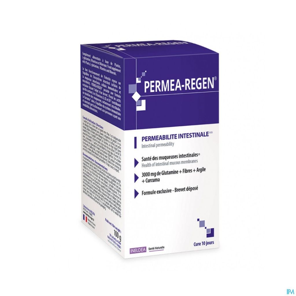 PERMEA-REGEN® bevat ook acaciavezels met een hoge spijsverteringstolerantie (fibregum™) om de microbiota te ondersteunen, evenals groene klei en 3 g glutamine .
