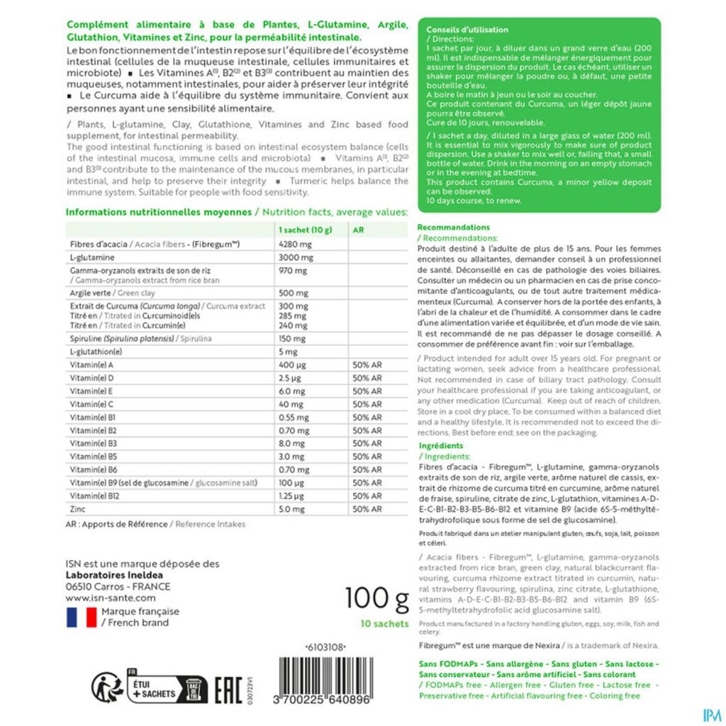 Ingrediënten: Acaciavezels - Fibregum™, L-glutamine, gamma-oryzanolen extracten van rijstzemelen, groene klei, natuurlijke zwarte bessensmaak, extract van Kurkuma wortelstok getitreerd in curcumine, natuurlijke aardbeiensmaak, Spirulina, Zinkcitraat, L-Glutathion, Vitaminen ADEC -B1-B2-B3-B5-B6-B12 en vitamine B9 (6S-5-methyltetrahydrofoliumzuur als glucosaminezout)
