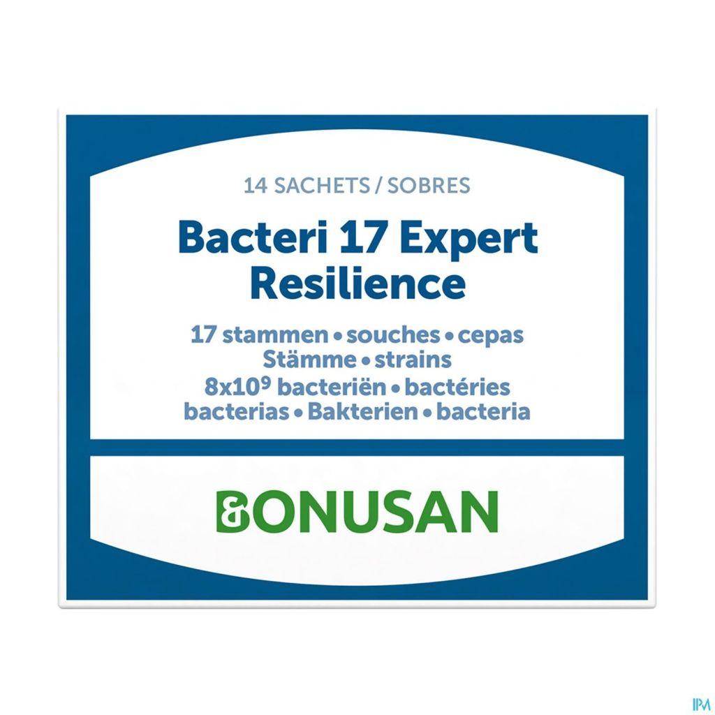 Bonusan Bacteri 17 Expert Resilience is met 17 verschillende bacteriestammen het breedste en meest geavanceerde probioticum op de markt. Hoe breder het spectrum, hoe beter dit past bij de natuurlijke situatie in de darm. Naast 5 soorten bifidobacteriën en 8 soorten lactobacillen bevat Bacteri 17 Expert Resilience daarom ook onder andere lactococcen, pediococcen en enterococcen. Omdat we overdoseren op het moment van productie, bevat elk sachet tot het eind van de houdbaarheidstermijn gegarandeerd minimaal 8 miljard levensvatbare bacteriën (KVE).