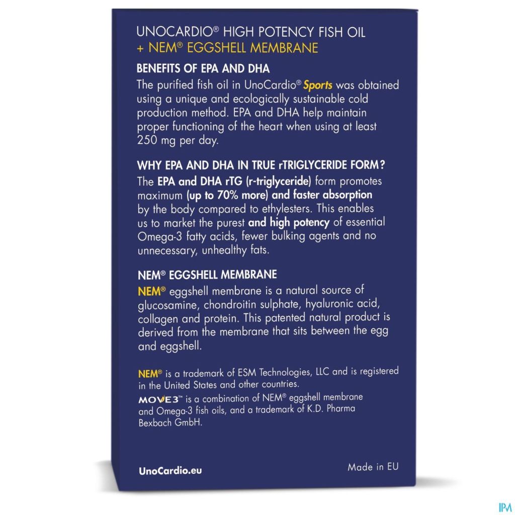 De gezuiverde visolie van UnoCardio®Sports werd verkregen via een unieke en ecologisch verantwoorde koude productiemethode. Dankzij de r-triglyceridevorm (r-TG) zijn de omega 3 vetzuren EPA en DHA maximaal opneembaar. EPA en DHA helpen de goede werking van het hart behouden bij gebruik van minstens 250 mg per dag.