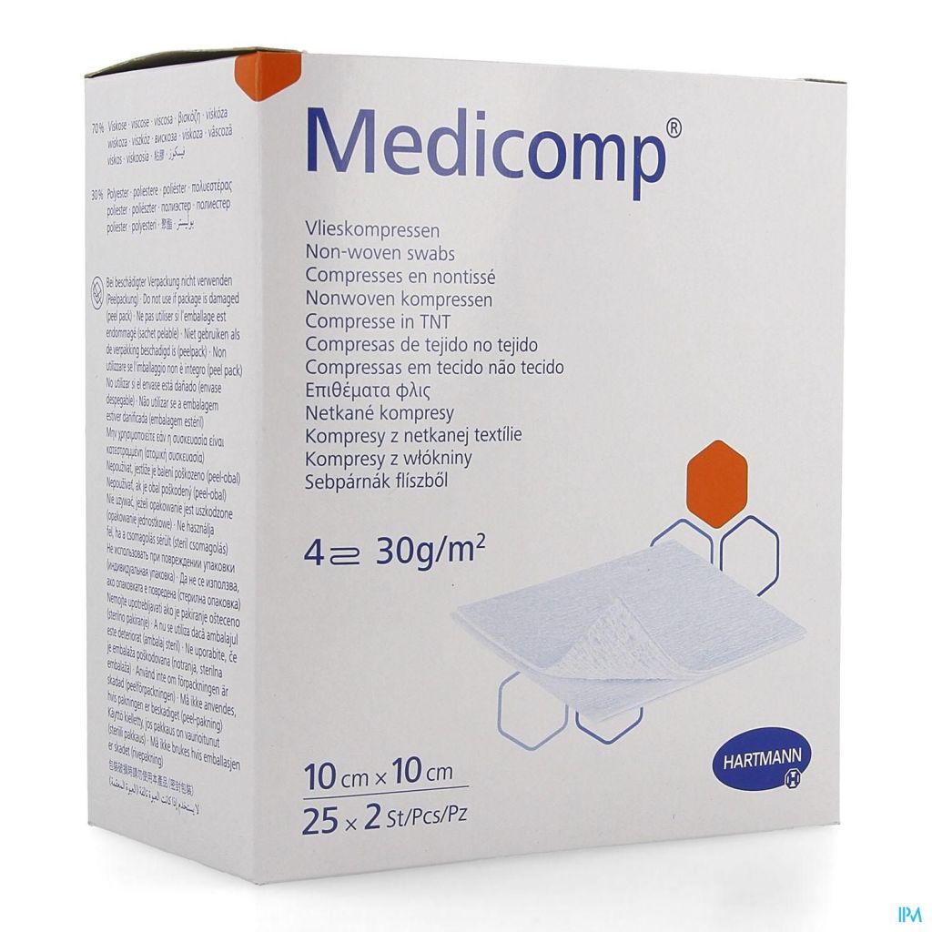 Non-woven kompres met gaasstructuur, gemaakt van 70% viscose en 30% polyestervezels; zeer absorberend, zacht en luchtdoorlatend; beschikbaar in 4 lagen (Medicomp) en 6 lagen (Medicomp extra), steriel en onsteriel.