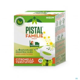 De Pistal Familie Elektrische verstuiver geeft u een snelle en eenvoudige oplossing voor uw huis en omgeving. De verstuiver combineert 100% natuurlijke citronella met vier essentiële oliën van plantaardige oorsprong voor een verfrissend citrus aroma.Gaat tot 45 nachten mee.