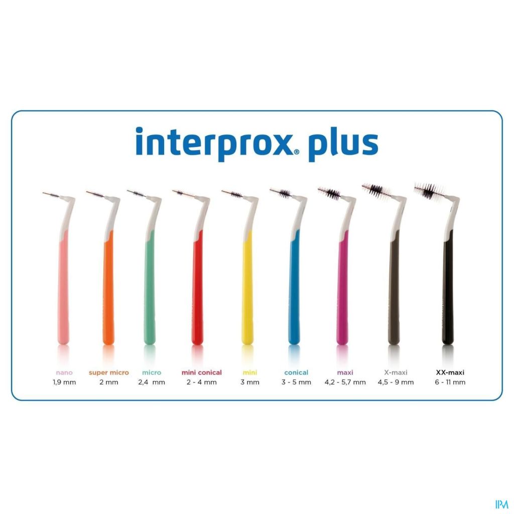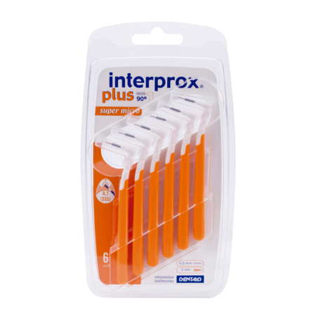 Interprox Plus Super Micro Oranje is speciaal ontwikkeld voor het reinigen van de ruimten tussen tanden vóór in de mond. Cariës (gaatjes) en tandvleesontstekingen beginnen vaak tussen tanden en kiezen. Deze ruimte reinig je het meest effectief met een interdentaal borsteltje. Een borsteltje is effectiever dan tandenstokers of rubbersticks. De borsteltjes van Interprox zijn voor dagelijks gebruik en gaan langer mee. Omdat de interdentale ruimten tussen tanden en kiezen varieert, is het belangrijk om voor iedere specifieke situatie het meest geschikte borsteltje te kiezen. Vraag je mondzorgprofessional welke maat het meest geschikt is. Interprox Plus Super Micro Oranje heeft een gehoekt handvat en beschikt over een cylindrisch gevormde borstelkop met PHD maat 0.9.