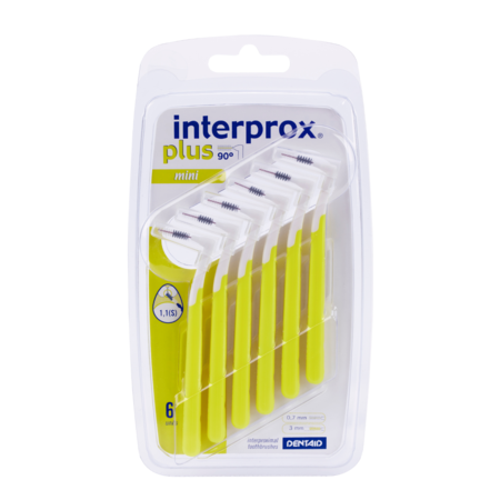 Interprox Plus Mini Geel is speciaal ontwikkeld voor het reinigen van de ruimten tussen tanden vóór in de mond. Cariës (gaatjes) en tandvleesontstekingen beginnen vaak tussen tanden en kiezen. Deze ruimte reinig je het meest effectief met een interdentaal borsteltje. Een borsteltje is effectiever dan tandenstokers of rubbersticks. De borsteltjes van Interprox zijn voor dagelijks gebruik en gaan langer mee. Omdat de interdentale ruimten tussen tanden en kiezen varieert, is het belangrijk om voor iedere specifieke situatie het meest geschikte borsteltje te kiezen. Vraag je mondzorgprofessional welke maat het meest geschikt is. Interprox Plus Mini Geel heeft een gehoekt handvat en beschikt over een cylindrisch gevormde borstelkop met PHD maat 1.4.