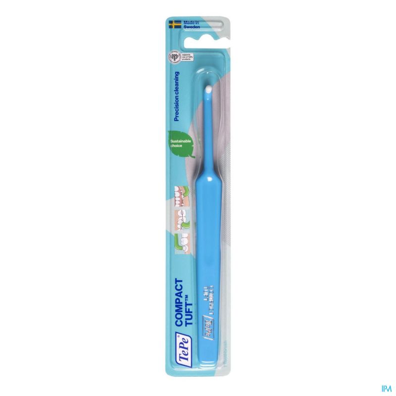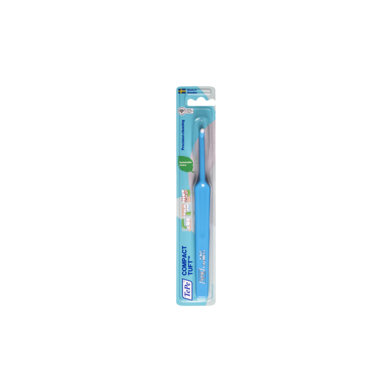 De Compact Tuft tandenborstel van TePe is een speciale gehoekte borstel met kleine tuft voor precisie reiniging. Dankzij het ontwerp kunnen de tanden grondiger worden gereinigd dan met een gewone tandenborstel, waardoor gebieden worden bereikt die normaal ontoegankelijk zijn. De afgeronde Compact Tuft met korte extra zachte haren zorgt voor een optimale balans tussen stabiliteit en verzorging.