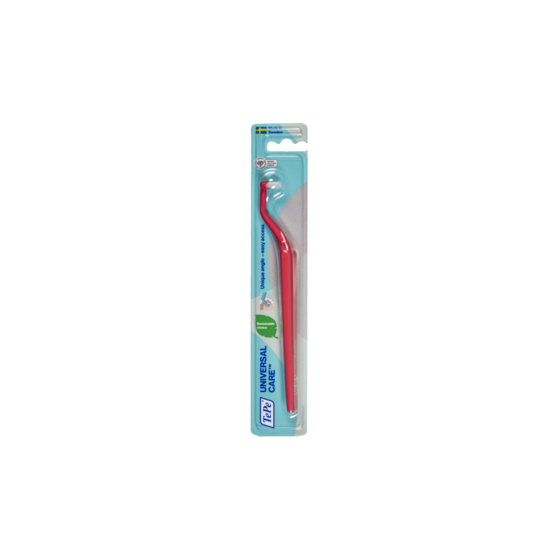 TePe Universal Care™ is een unieke gebogen tandenborstel om moeilijk bereikbare plaatsen gemakkelijk toegankelijk te maken. Optimaal voor tong gelegen beugels, draden en implantaten.