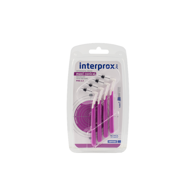 Interprox Plus Maxi Conical Paars is speciaal ontwikkeld voor het reinigen van de ruimten tussen tanden vóór in de mond. Cariës (gaatjes) en tandvleesontstekingen beginnen vaak tussen tanden en kiezen. Deze ruimte reinig je het meest effectief met een interdentaal borsteltje. Een borsteltje is effectiever dan tandenstokers of rubbersticks. De borsteltjes van Interprox zijn voor dagelijks gebruik en gaan langer mee. Omdat de interdentale ruimten tussen tanden en kiezen varieert, is het belangrijk om voor iedere specifieke situatie het meest geschikte borsteltje te kiezen. Vraag je mondzorgprofessional welke maat het meest geschikt is. Interprox Plus Maxi Conical Paars heeft een gehoekt handvat en beschikt over een cylindrisch gevormde borstelkop met PHD maat 2.3.