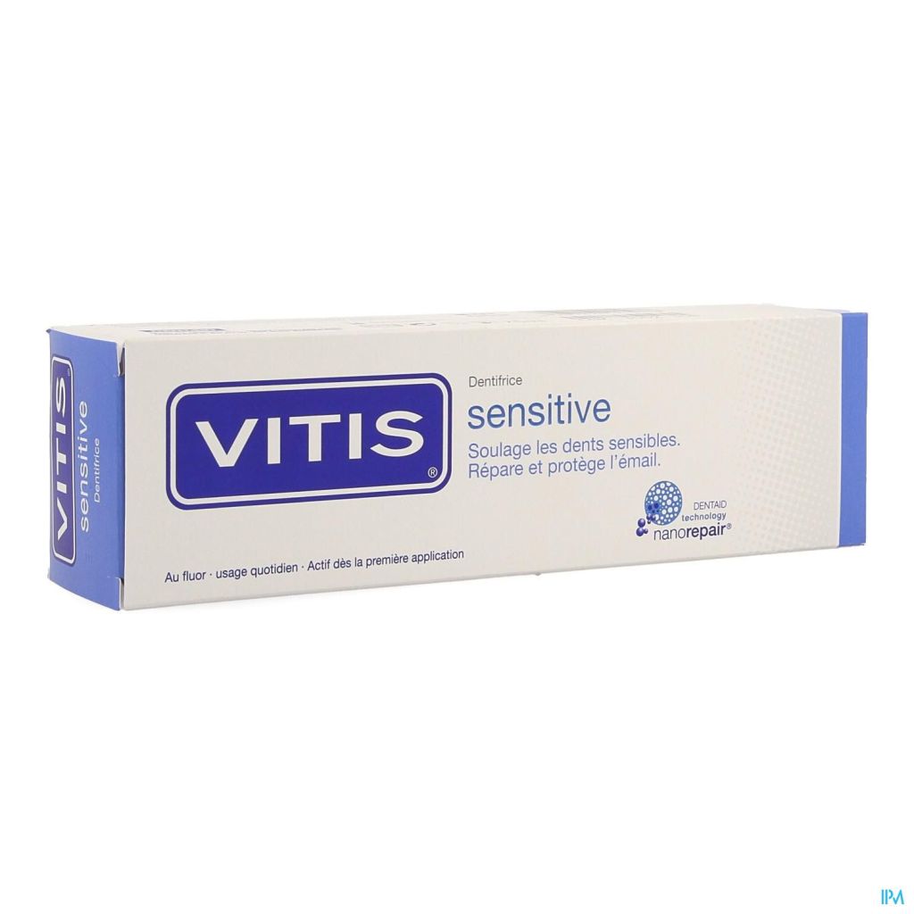 VITIS Sensitive Tandpasta is een dagelijks te gebruiken tandpasta tegen tandgevoeligheid. De tandpasta-formule is ontwikkeld met de revolutionaire DENTAID Haprepair Technologie (met 5-voudige werking). Deze DENTAID Haprepair Technologie is gebaseerd op minuscule deeltjes van hydroxyapatite die zich hechten aan het tandoppervlak. Door hun minuscule grootte kunnen deze deeltjes volledig in het glazuur en de dentine worden opgenomen. Tanden en kiezen worden beter beschermd tegen invloeden van buitenaf.
