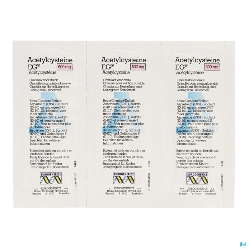 Acetylcysteine EG 600Mg Gran. Vr Drank Zakje 30 is een geneesmiddel : Lees de bijsluiter zorgvuldig. Niet langdurig gebruiken zonder medisch advies.