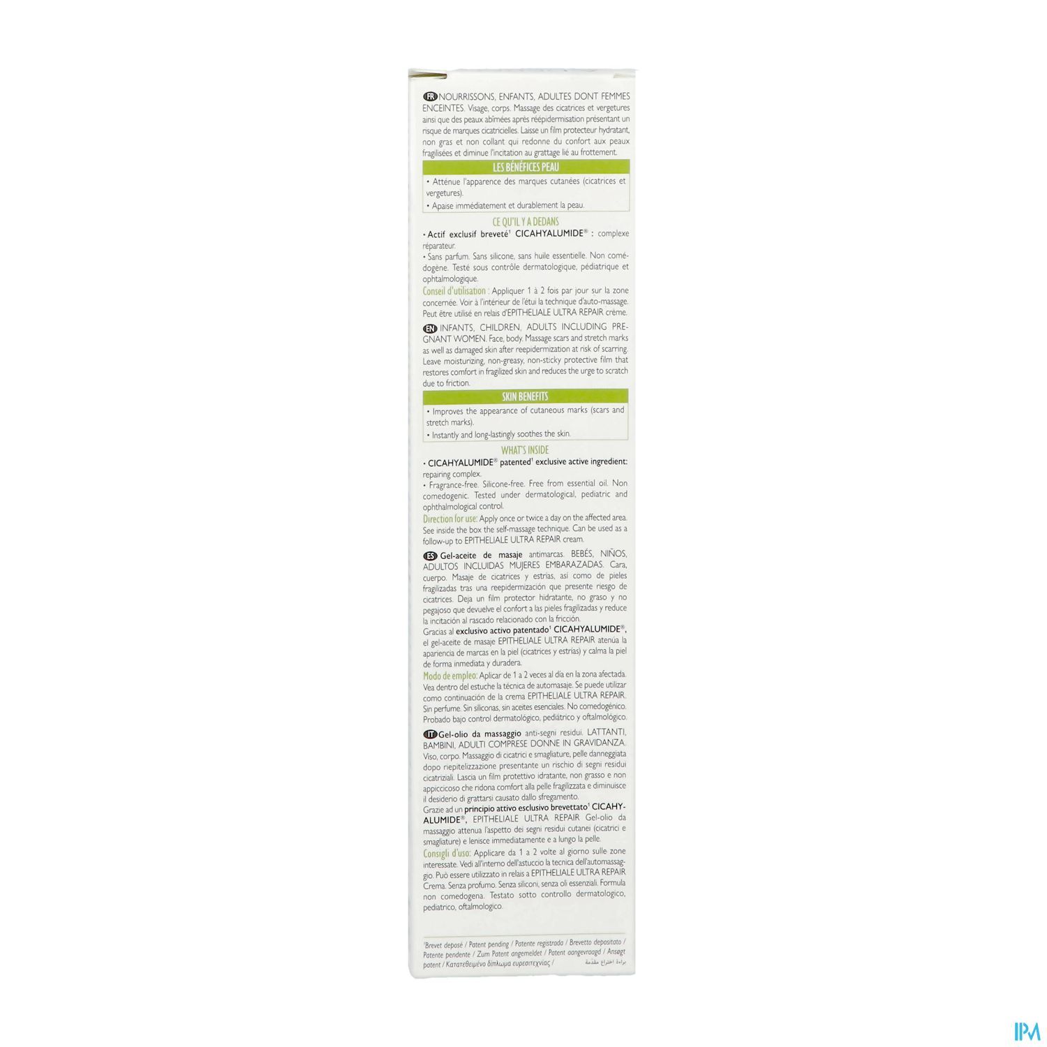 Breng deze massagegel-olie één of twee keer per dag aan om littekens* en striemen te helpen vervagen. Een gepatenteerde** gel-olietextuur die niet druipt en vloeibaar wordt tijdens de massage. Dit gebaar is aanbevolen om de microcirculatie te bevorderen en te stimuleren, de hydratatie te optimaliseren en een trekkerig en jeukend gevoel te verminderen. De formule van de EPITHELIALE ULTRA REPAIR massagegel-olie bevat geen silicone en essentiële oliën en bestaat uit slechts negen ingrediënten, waarvan 98% van natuurlijke oorsprong is. Het verbetert het uitzicht van de vlekken op de huid bij 100% van de proefpersonen¹. Deze gel-olie kan gebruikt worden als zwangerschapsolie tegen striemen. Het is geschikt om zwangerschapsstriemen te voorkomen en te verminderen en biedt een zachte verzorging voor de huid van moeders in spe, maar is ook ideaal voor het hele gezin. Rhealba® haver van biologische teelt. Vegan Info: bevat geen ingrediënten van dierlijke oorsprong.