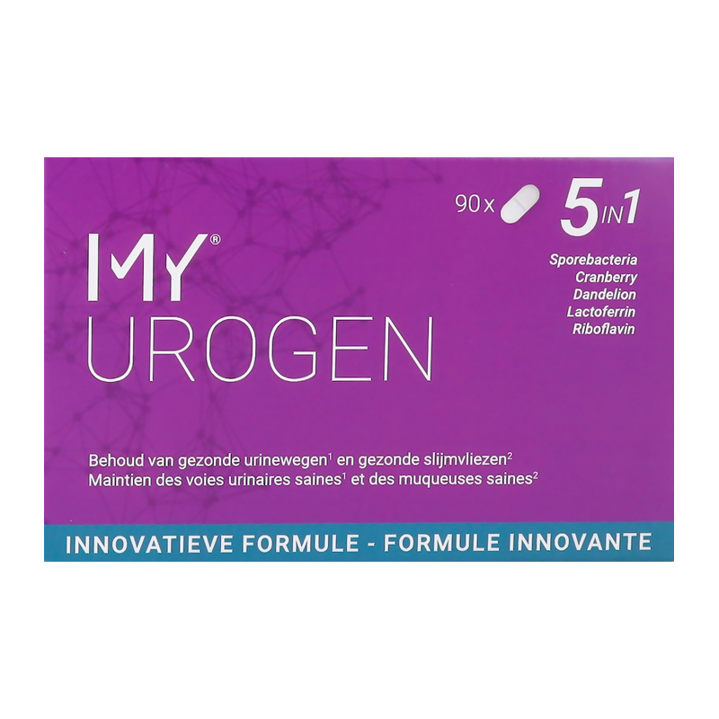 MY®UROGEN bevat per tablet 500 mg veenbes extract (Vaccinium macrocarpon), 105 mg paardenbloem extract (Taraxacum officinale), 2,5 miljard CFU sporenvormende bacteriën (Bacillus coagulans en Bacillus subtilis), 50 mg lactoferrine (eiwit afgeleid uit melk) aangevuld met 1,4 mg vitamine B2 (100% RI). RI: referentie-inname.