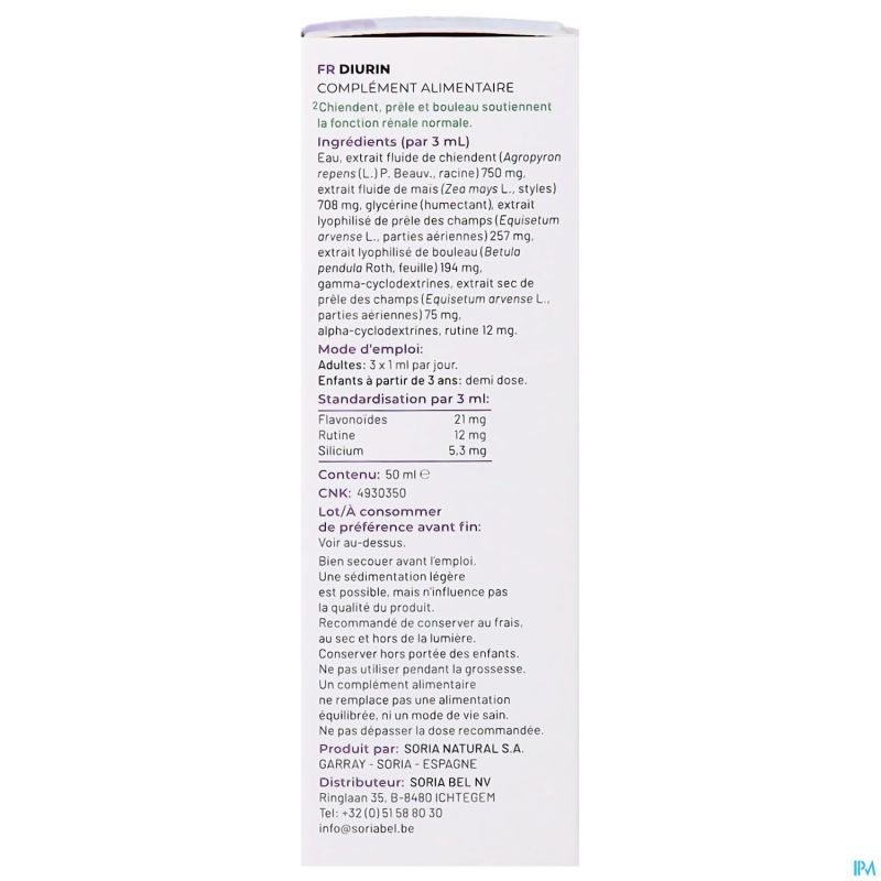 Water, vloeibaar extract van kweekgras (Agropyron repens (L.) P. Beauv., wortel) 750 mg, vloeibaar extract van maïs (Zea mays L., stijlen) 708 mg, glycerine (bevochtigingsmiddel), gevriesdroogd extract van heermoes (Equisetum arvense L., bovengrondse delen) 257 mg, gevriesdroogd extract van berk (Betula pendula Roth, blad) 194 mg, gamma-cyclodextrines, droog extract van heermoes (Equisetum arvense L., bovengrondse delen) 75 mg, alfa-cyclodextrines, rutine 12 mg.