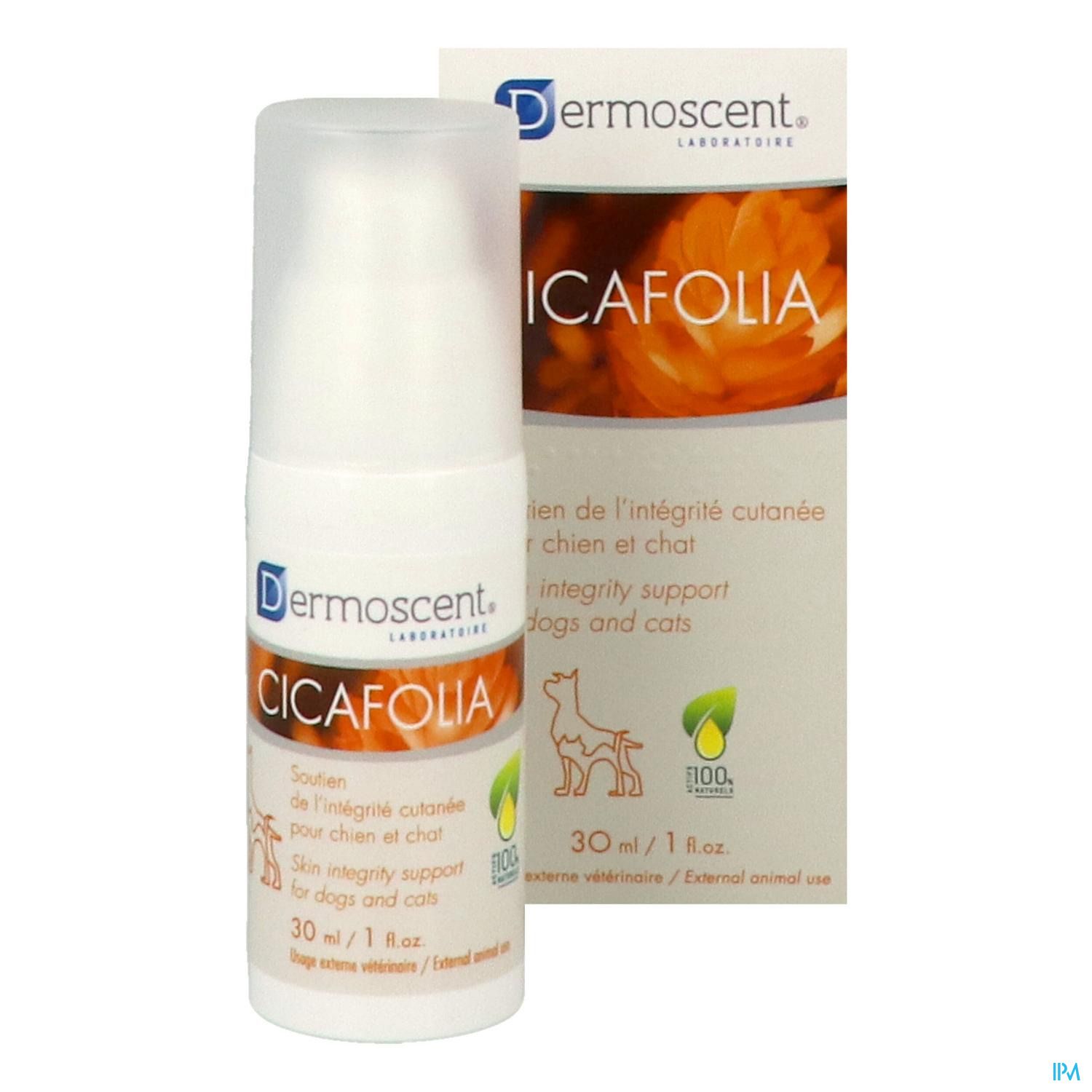 Cicafolia lotion van Dermoscent beschermt en verzorgt de geprikkelde huid van uw hond of kat. Cicafolia creëert een omgeving waarin de huid schoon blijft en ondersteunt het herstellend vermogen van de huid. Na het aanbrengen, vormt de lotion een dun transparant laagje. Dit beschermt de huid zonder dat de bewegingsvrijheid van het dier belemmerd wordt. De bittere smaak van Dermoscent Cicafolia helpt dat uw hond of kat niet aan de plekken gaat likken of bijten.