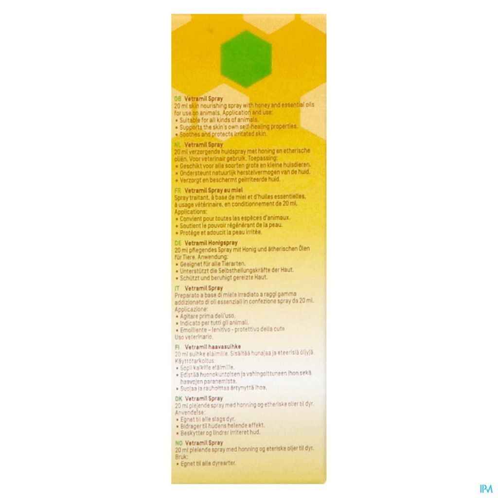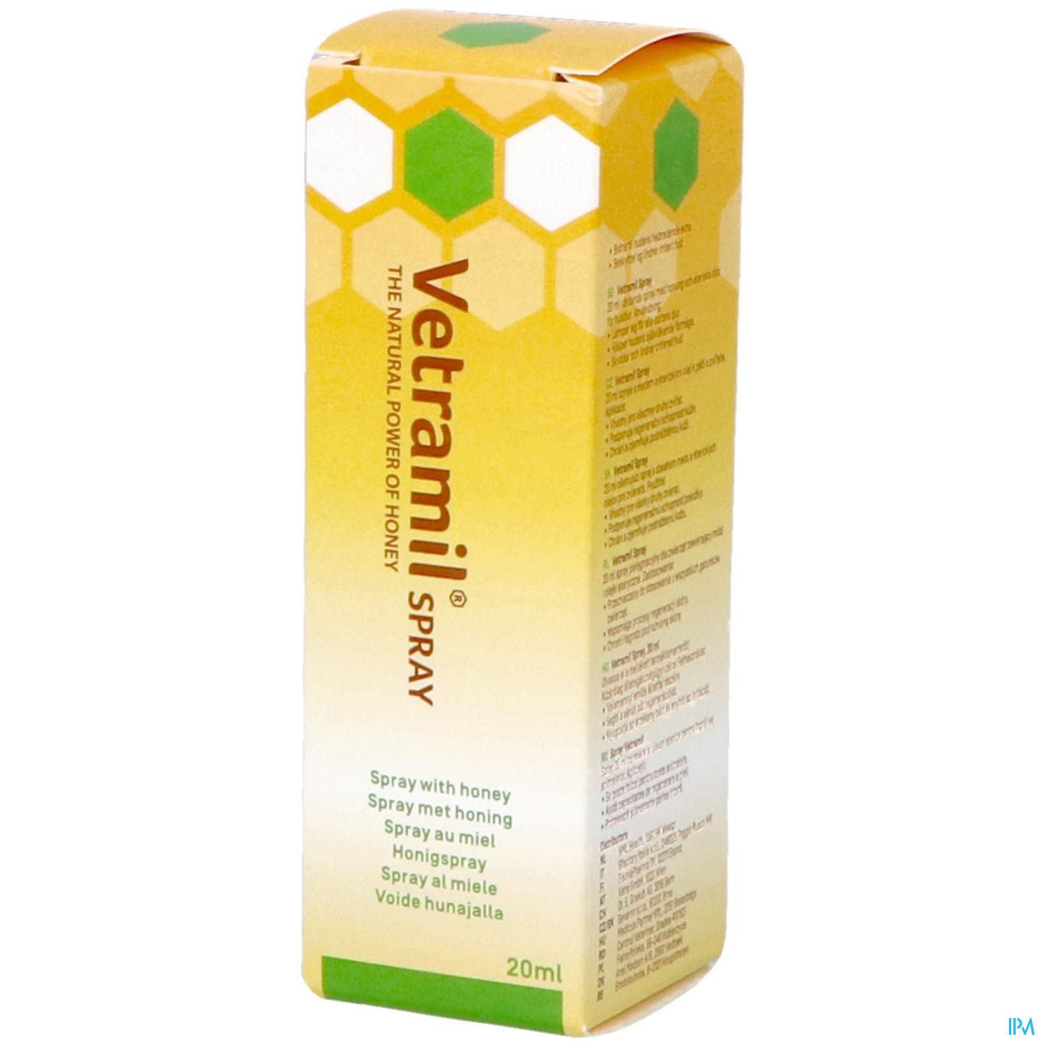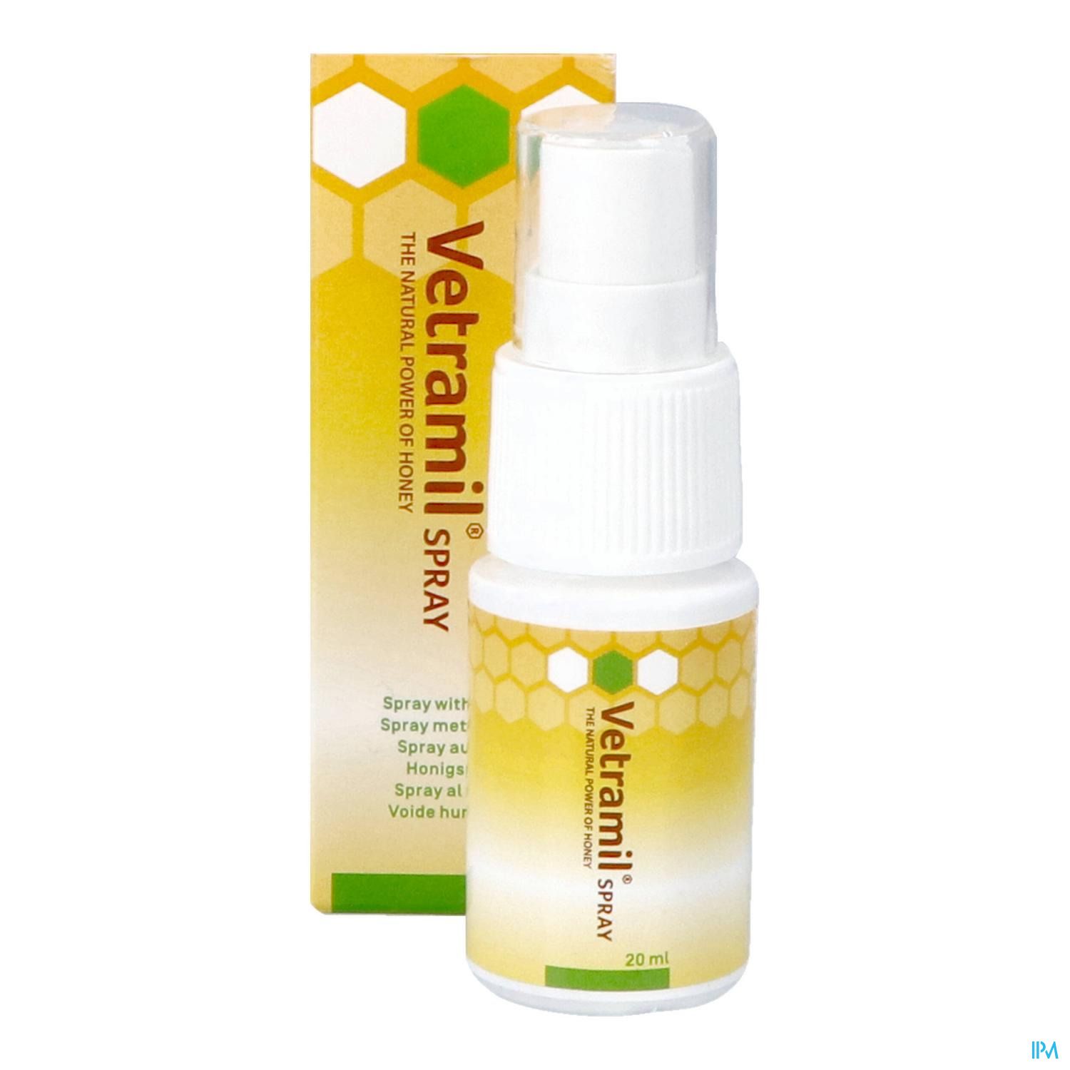 Vetramil Spray is speciaal ontwikkeld voor dieren met een ruwe en geprikkelde huid. De spray bevat dezelfde belangrijke ingrediënten als Vetramil honingzalf (enzymrijke honing, essentiële oliën). De actieve honing elementen zijn daarmee in vloeibare vorm en met goede 'sproei' eigenschappen beschikbaar. Vetramil Spray vormt een dunne, langdurige beschermlaag. Door de combinatie van honing en essentiële oliën ondersteunt Vetramil Spray het herstel van de huid. De spray is speciaal bedoeld voor moeilijk te bereiken plekken (bv. de benen van een paard) of grote plekken (bv . de buik van een hond), maar ook voor dieren die zich niet makkelijk op een gevoelige plek laten behandelen. Het sprayen maakt geen geluid, zodat dieren ook rustig blijven bij het aanbrengen.