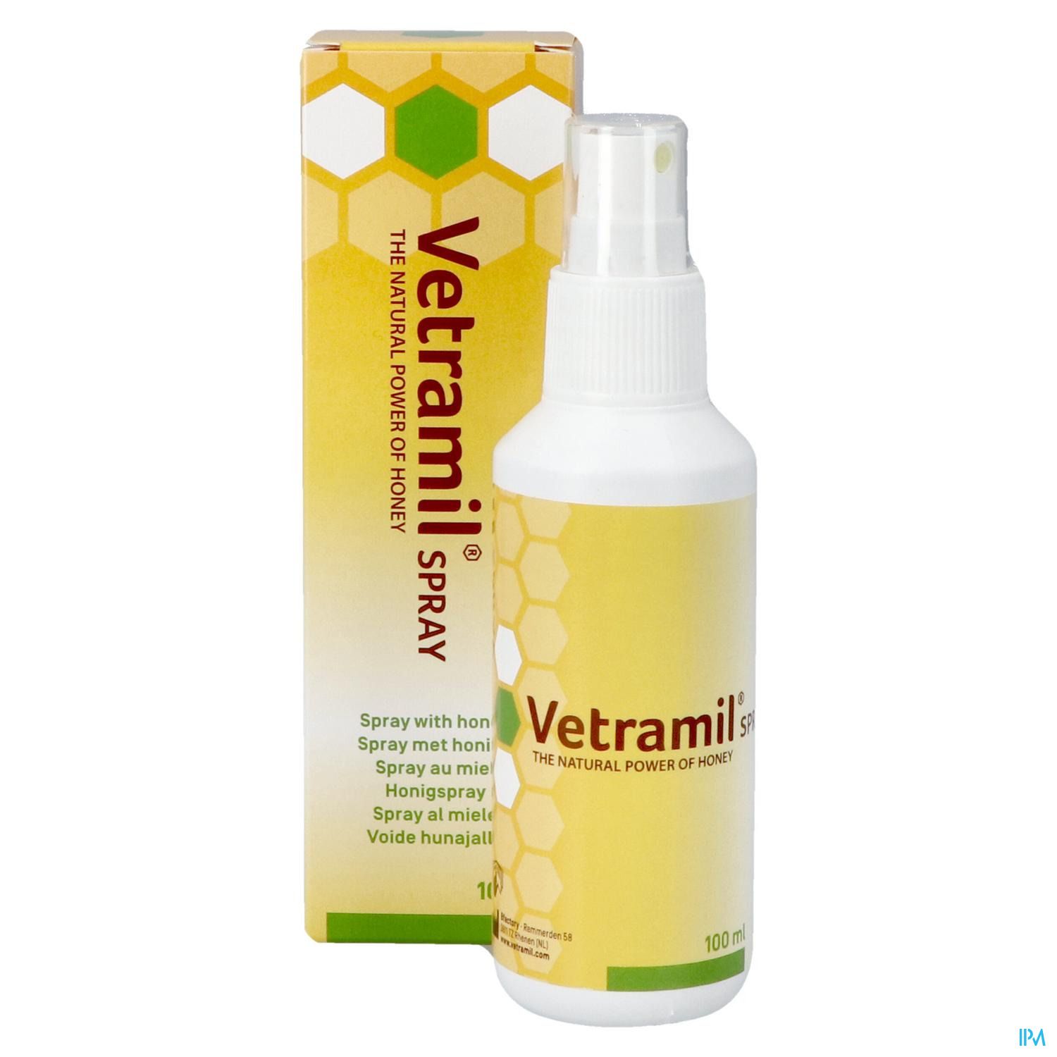 Vetramil Spray is speciaal ontwikkeld voor dieren met een ruwe en geprikkelde huid. De spray bevat dezelfde belangrijke ingrediënten als Vetramil honingzalf (enzymrijke honing, essentiële oliën). De actieve honing elementen zijn daarmee in vloeibare vorm en met goede 'sproei' eigenschappen beschikbaar. Vetramil Spray vormt een dunne, langdurige beschermlaag. Door de combinatie van honing en essentiële oliën ondersteunt Vetramil Spray het herstel van de huid. De spray is speciaal bedoeld voor moeilijk te bereiken plekken (bv. de benen van een paard) of grote plekken (bv . de buik van een hond), maar ook voor dieren die zich niet makkelijk op een gevoelige plek laten behandelen. Het sprayen maakt geen geluid, zodat dieren ook rustig blijven bij het aanbrengen.