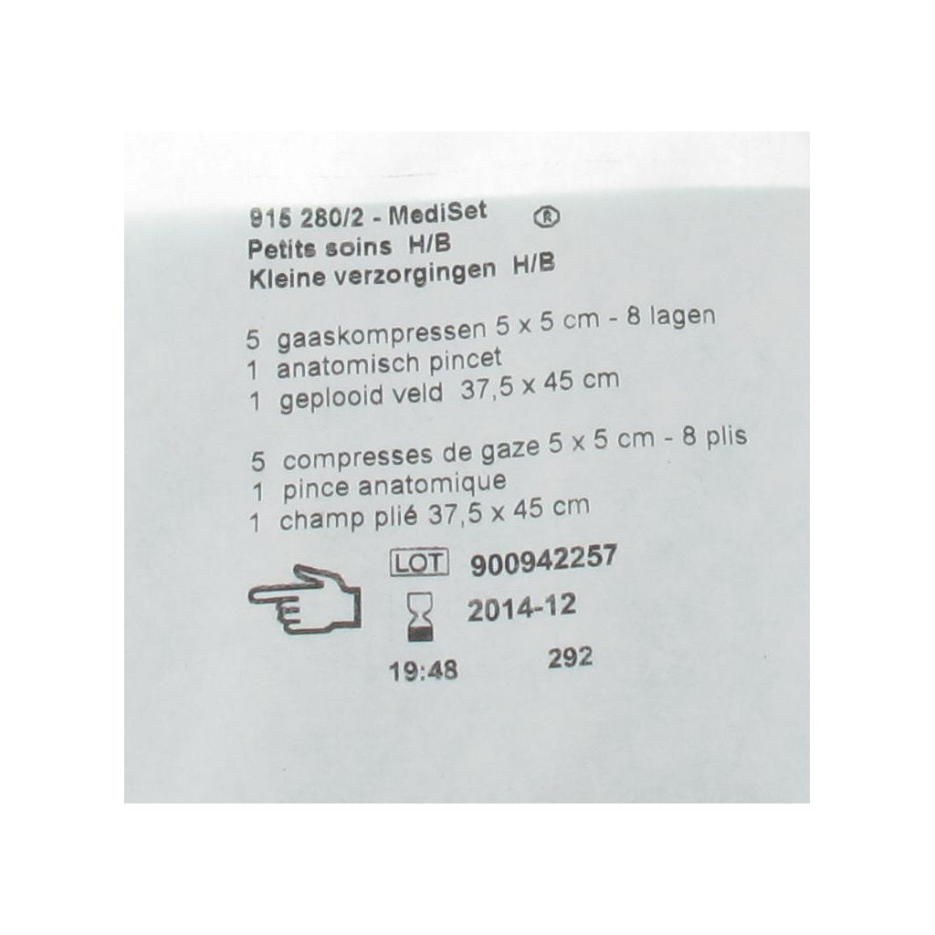 Wondverzorgingsset in een harde blister, 3 compartimenten:- Kan als tray gebruikt worden - Compartimenten voor ontsmettingsmiddel of vloeistof Inhoud: 5 Gaaskompressen 5 x 5 cm (8 lagen) 1 Anatomisch pincet polypropyleen 12,5 cm blauw 1 Ondoordringbaar veld 38 x 45 cm