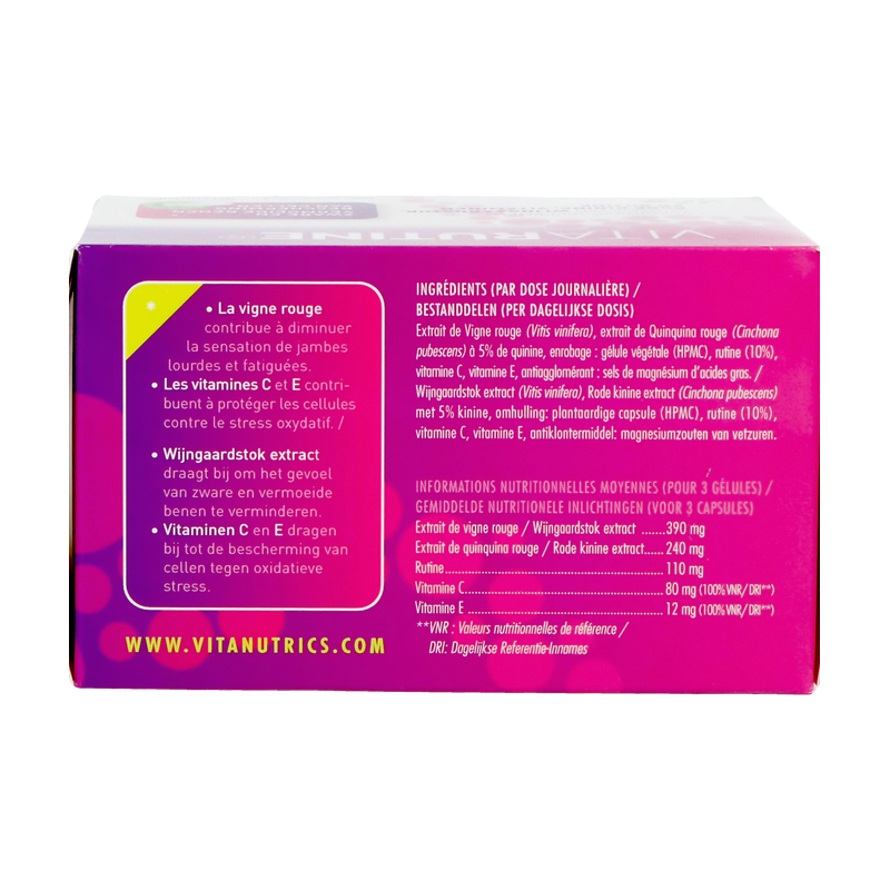 Wijngaardstok extract (Vitis vinifera), Rode kinine extract (Cinchona pubescens) met 5% kinine, omhulling: plantaardige capsule (HPMC), rutine (10%), vitamine C, vitamine E, antiklontermiddel: magnesiumzouten van vetzuren.
