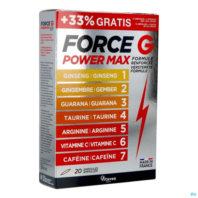 Force G Power Max is een voedingssupplement met ginseng, gember, guarana, taurine, arginine, vitamine C en cafeïne.