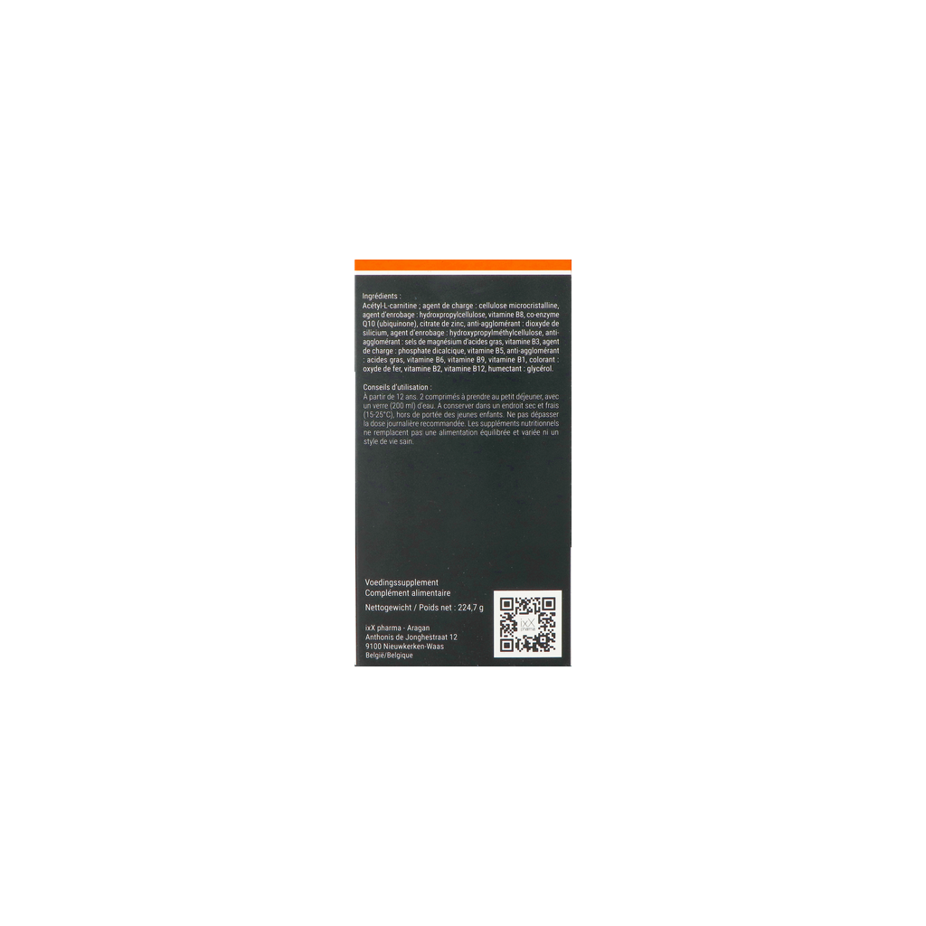 (Acetyl-L-carnitine, vulstof: microkristallijne cellulose, glansmiddel: hydroxpropylcellulose, vitamine B8, co-enzym Q10 (ubiquinone), zinkcitraat, antiklontermiddel: siliciumdioxide, glansmiddel: hydroxypropylmethylcellulose, antiklontermiddel: magnesiumzouten van vetzuren, vitamine B3, vulmiddel: dicalciumfosfaat, vitamine B5, anti-klontermiddel: vetzuren, vitamine B6, vitamine B9, vitamine B1, kleurstof: ijzeroxide, vitamine B2, vitamine B12, bevochtigingsmiddel: glycerol.)