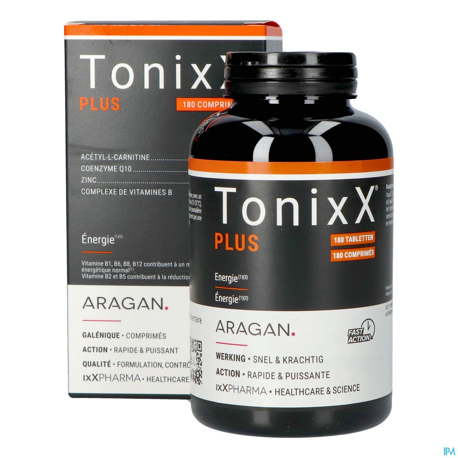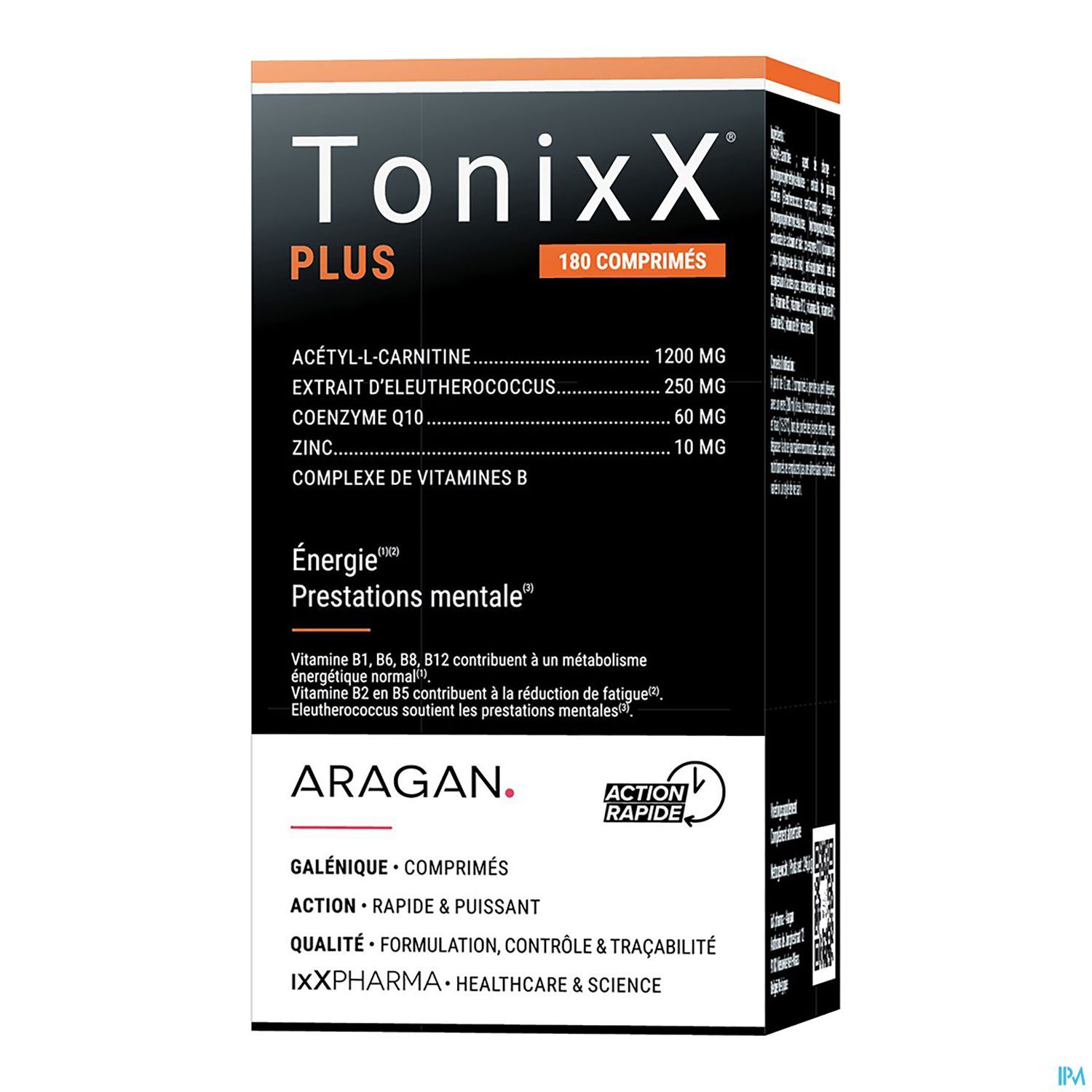 2 tabletten TonixX PLUS bevatten 1500mg acetyl-L-carnitine, 100 mg co-enzym Q10, 1,1 mg vitamine B1 (100% RI), 1,4 mg vitamine B2 (100% RI), 16 mg vitamine B3 (100% RI), 6 mg vitamine B5 (100% RI), 1,4 mg vitamine B6 (100% RI), 2,5 µg vitamine B12 (100% RI), 200 µg foliumzuur (100% RI), 50 µg biotine (100% ADH) en 10 mg zink (100% RI, onder vorm van bisglycinaat, een moderne, goed opneembare vorm).
