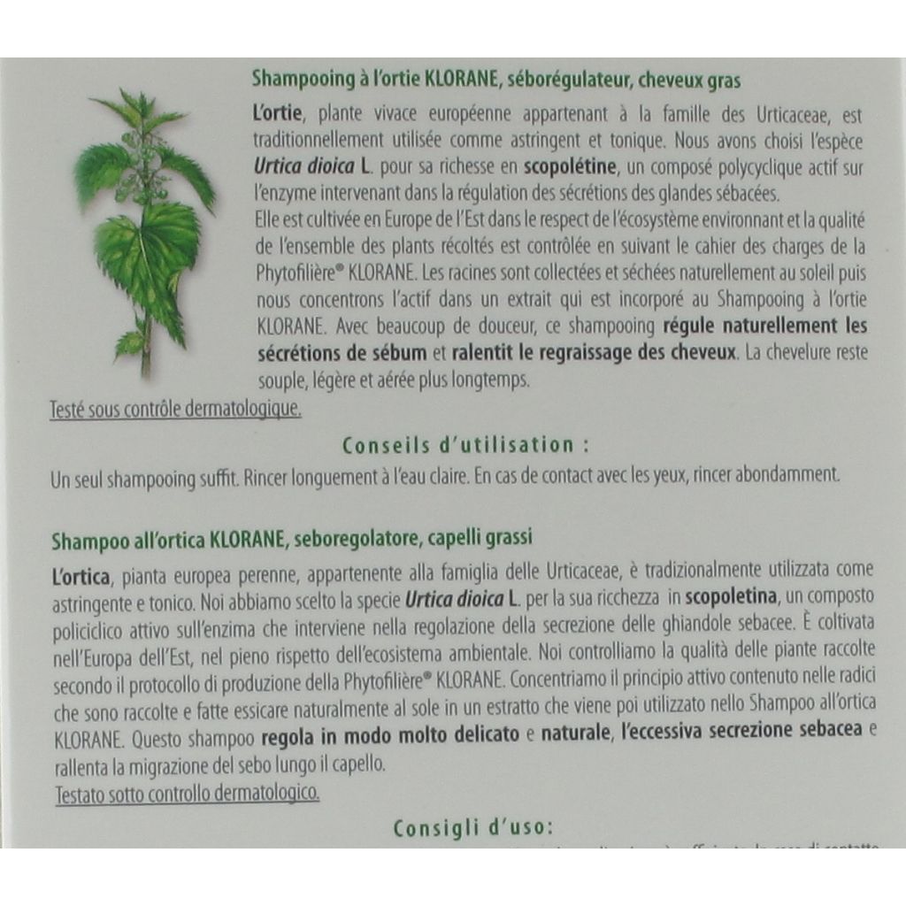 Deze shampoo maakt het haar zijig, soepel en luchtig. Hypoallergeen. De KLORANE Talgregulerende shampoo met brandnetelextract kreeg veel positieve reacties:Geen vet haar meer: 94%* *Gebruikstest gedurende 2 weken, 32 vrouwen