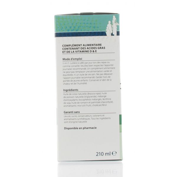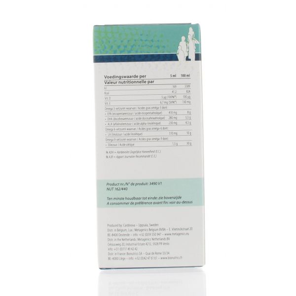- Omega 3-, 6-, 9-vetzuren, vitamine D en vitamine E in vloeibare vorm