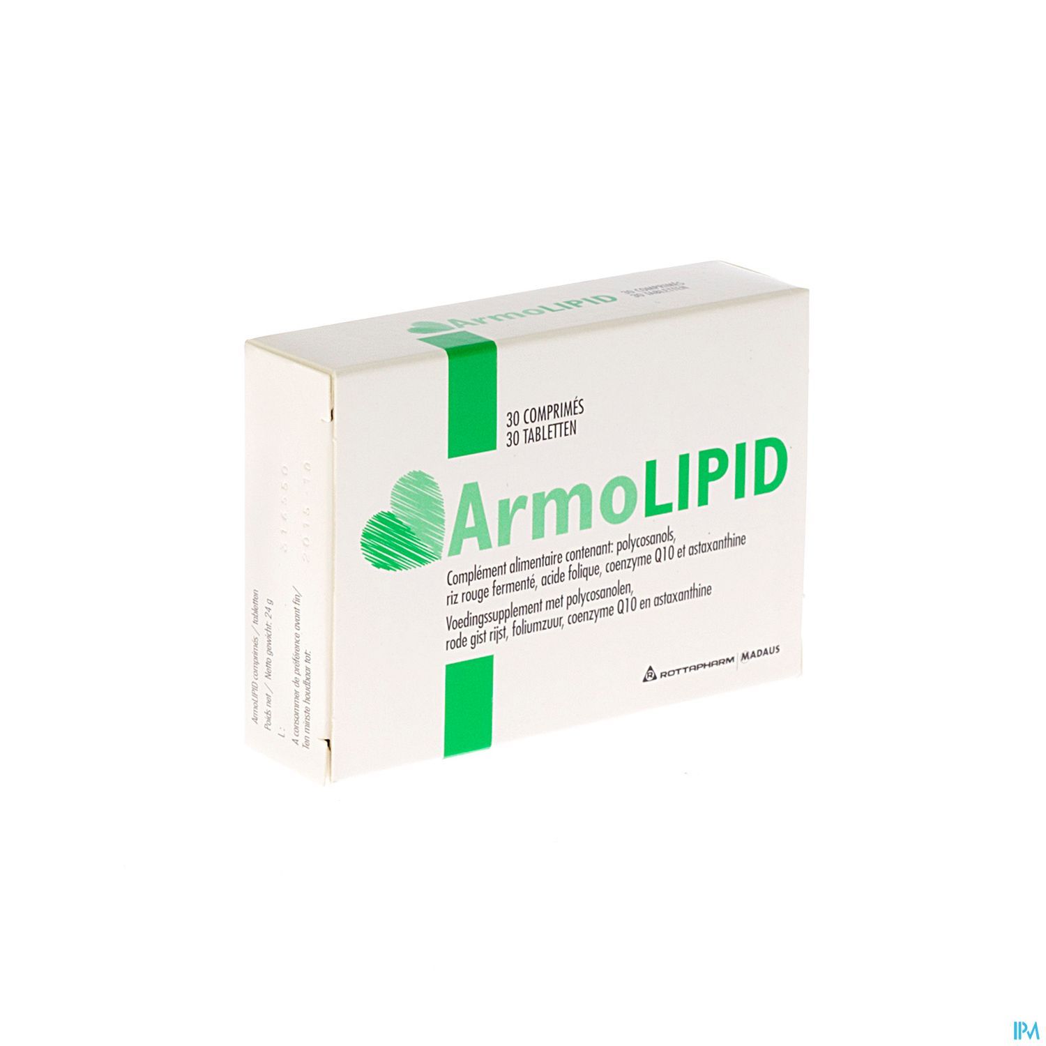 Armolipid® is een natuurlijk voedingssupplement met rode gist rijst, polycosanolen (een mengeling van natuurlijke vetalcoholen), foliumzuur, co-enzym Q10 (een bestanddeel van de lichaamscellen) en astaxanthine (rozerood pigment dat zich onder meer in micro-algen bevindt).