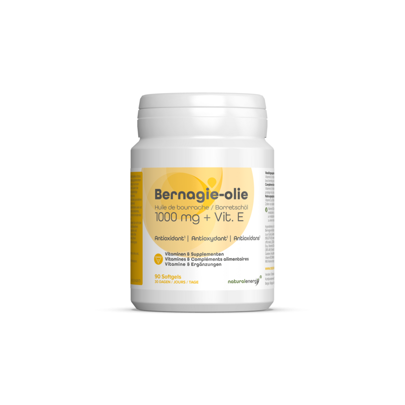 Zuivere Bernagie-olie gestandaardiseerd op 20% GLA met Vitamine E die beschermt tegen oxidative stress.