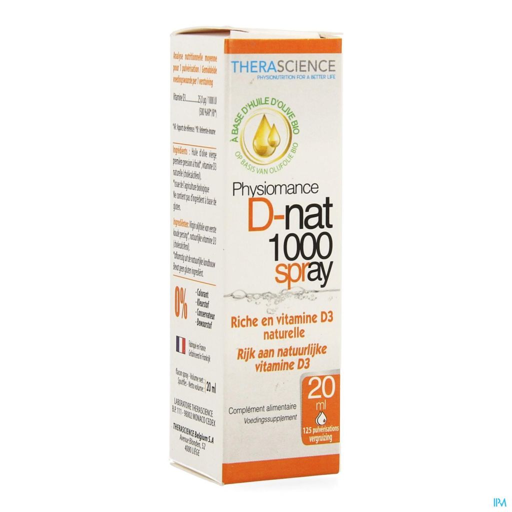 PHYSIOMANCE D-NAT 1000 SPRAY levert 1.000 IE* (25 μg) natuurlijke vitamine D3 door het in de mond te spuiten in een natuurlijke, biobeschikbare vorm.