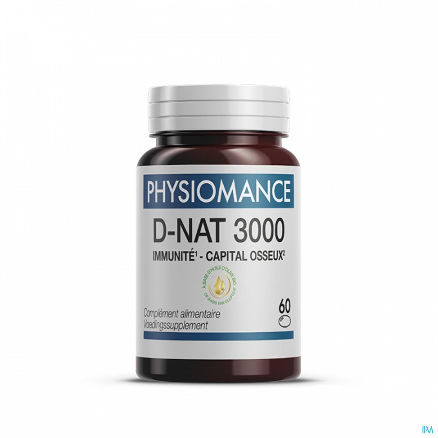 PHYSIOMANCE D-NAT 3000 levert 3.000 IE* (75 μg) natuurlijke vitamine D3 per druppel of per capsule, in een natuurlijke en biologisch beschikbare vorm. Vitamine D is essentieel voor een goede werking van de cellen van het immuunsysteem. Essentieel voor de gezondheid van de botten, noodzakelijk voor de groei, mineralisatie en ontwikkeling van de botten, werkt het in op de opname van calcium en fosfor. Vitamine D is betrokken bij de spierfunctie en speelt ook een belangrijke rol bij de celdeling.
