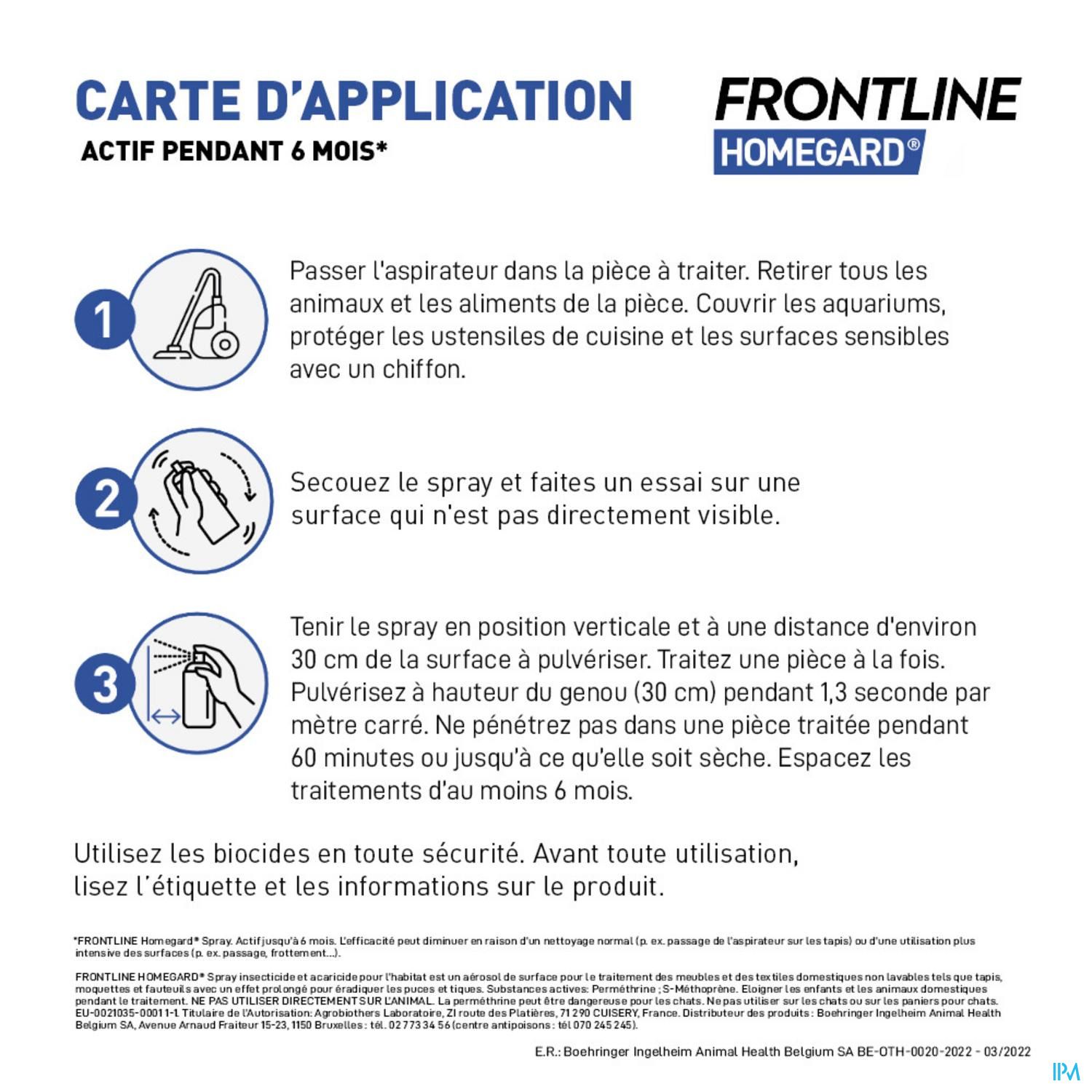 FRONTLINE® HomeGard is een omgevingsspray voor huishoudelijk gebruik die vlooien, vlooienlarvenlarven en teken in huis en in de omgeving doodt. Het heeft een langdurige werking tot 6 maanden. Met zijn snel én langdurig werkende formule helpt FRONTLINE® HomeGard een vlooienplaag nog doeltreffender het hoofd te bieden.