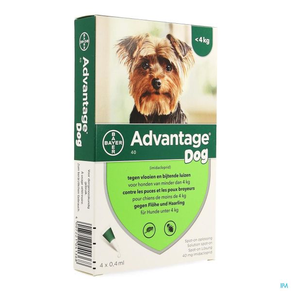 Pipet Imidacloprid E321 Advantage Dog 40 (< 4 kg) 0,4 ml 40 mg 0,4 mg Advantage Dog 100 (≥ 4 < 10 kg) 1,0 ml 100 mg 1,0 mg Advantage Dog 250 (≥ 10 < 25 kg) 2,5 ml 250 mg 2,5 mg Advantage Dog 400 (≥ 25 kg) 4,0 ml 400 mg 4,0 mg