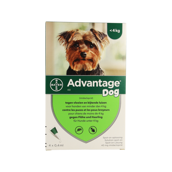 Minder dan 4 kg Advantage Dog 40 1 x 0,4 ml minimaal 10 4 tot minder dan 10 kg Advantage Dog 100 1 x 1,0 ml minimaal 10 10 tot minder dan 25 kg Advantage Dog 250 1 x 2,5 ml minimaal 10 25 tot minder dan 40 kg Advantage Dog 400 1 x 4,0 ml minimaal 10 Meer dan 40 kg Advantage Dog 400 2 x 4,0 ml minimaal 10