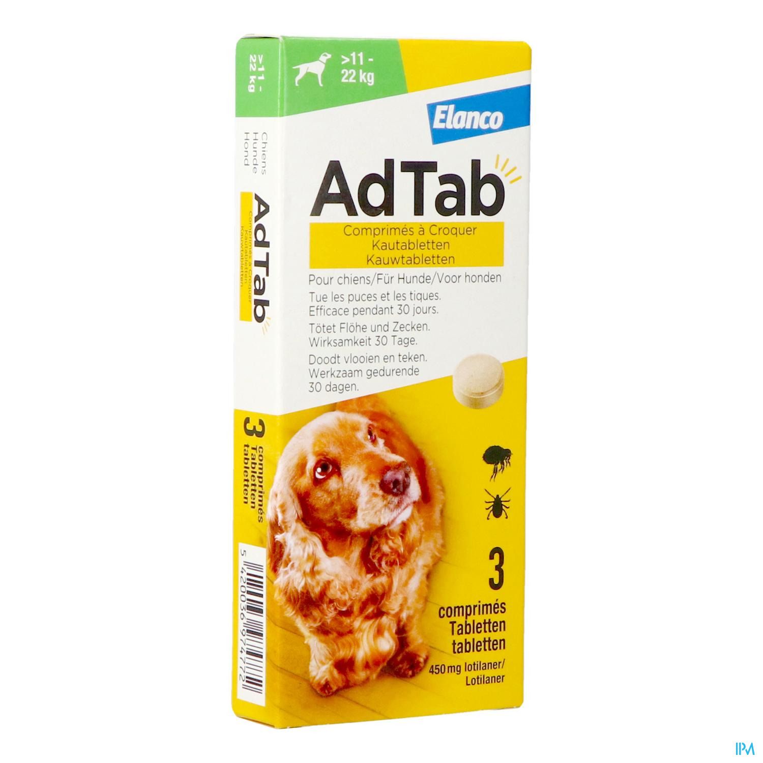 AdTab?? is een kleine kauwtablet met vleessmaak voor honden die snel werkt tegen teken en vlooien. Het is een veilig en doeltreffend middel dat al na 4 uur begint te werken. AdTab?? is 30 dagen werkzaam.