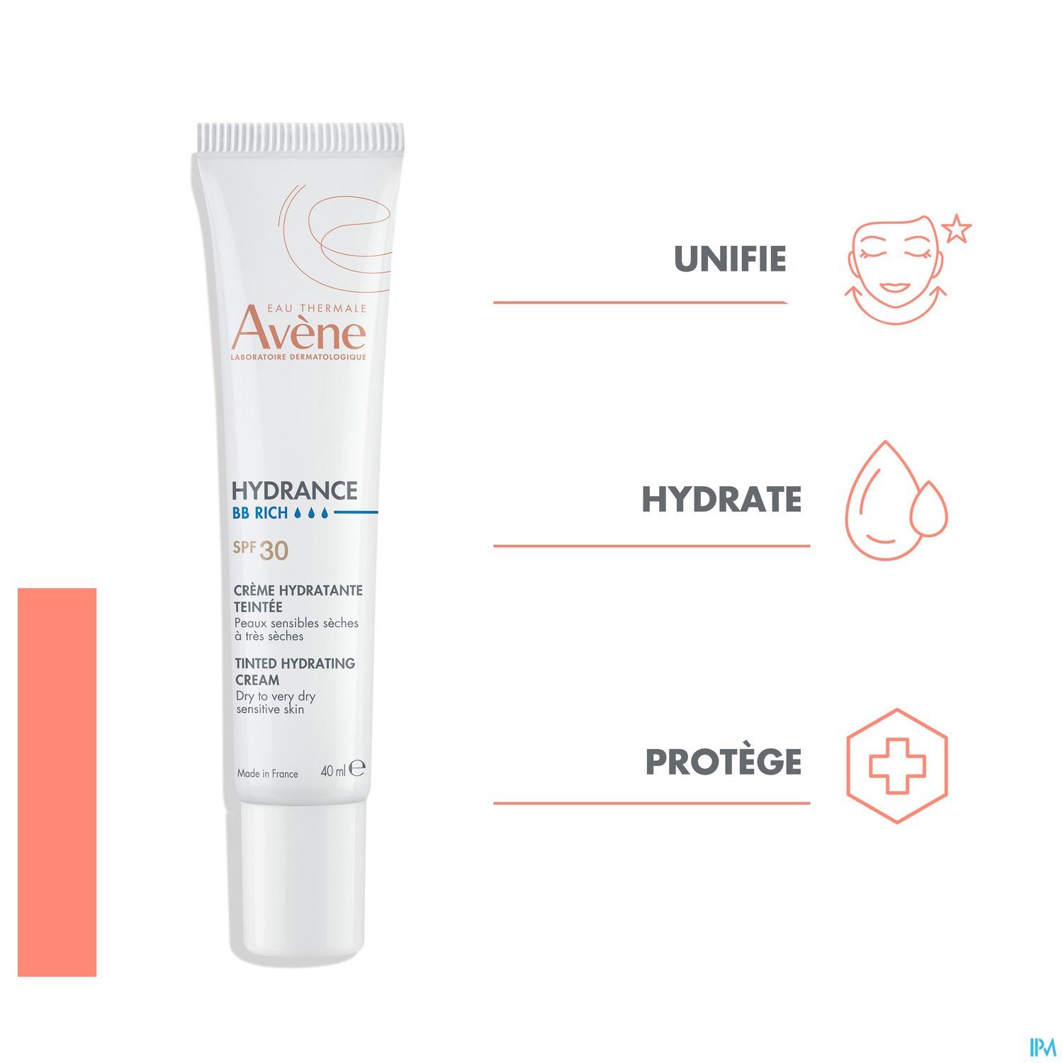 De Getinte Hydraterende Crème Hydrance BB Rijk kan apart of als make-up basis worden gebruikt en biedt 24 uur lang hydratatie. De crème egaliseert de gevoelige, droge tot zeer droge vochtarme huid, voor een natuurlijke gezonde gloed. Het verlicht en beschermt de huid dankzij de SPF 30 zonbescherming. De subtiele kleur past bij heel wat huidtinten. De fluweelzachte textuur zorgt de hele dag lang voor een zachte huid die aangenaam aanvoelt.