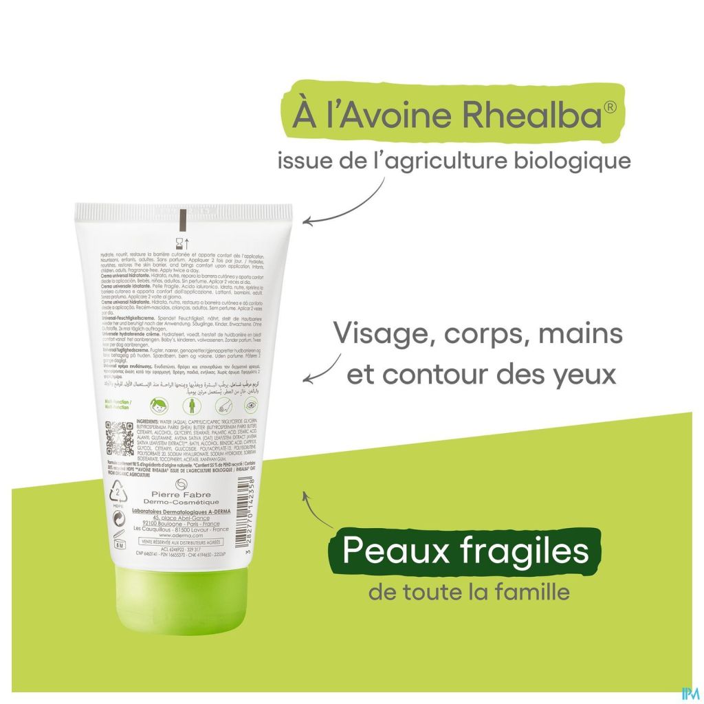 Deze crème hydrateert, voedt, bevordert het herstel* en kalmeert de huid van het gezicht en het lichaam van het hele gezin, maar ook de oogcontouren, de handen en na het scheren. Een multifunctionele crème, met 98% ingrediënten van natuurlijke oorsprong. Het bevat actieve bestanddelen met erkende eigenschappen: Rhealba® Haverextract met verzachtende en anti-irriterende eigenschappen. Hyaluronzuur met hydraterende en herstellende eigenschappen. Sheaboter met voedende eigenschappen. Hydraterende en beschermende plantaardige glycerine. De fragiele huid van het hele gezin, inclusief zuigelingen (vanaf 28 dagen oud) wordt 24 uur lang gehydrateerd met +62% hydratatie vanaf het 1e uur¹. Het verzachtende effect werd door 98% van de proefpersonen² toegejuicht, na slechts 3 testdagen. Irritaties worden onmiddellijk verzacht en de huid wordt tot 6 uur lang gevoed. Niet geparfumeerd en met een fysiologische pH, geformuleerd om het risico op allergische reacties te minimaliseren. De verpakking is eco-ontworpen en de tube bevat 54% gerecycleerd HDPE*. Rhealba® Haver van biologische teelt. Vegan Info: zonder dierlijke ingrediënten. *Bevordert het herstel van de epidermis.