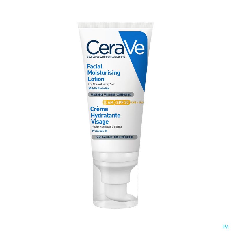 De hydraterende gezichtscrème met SPF30 van CeraVe is een veelzijdige dagcrème. Met drie essentiële ceramiden, hydraterend hyaluronzuur en verzachtende niacinamide maakt deze gezichtscrème ook gebruik van de gepatenteerde MVE technologie, om de huid gedurende de hele dag te voeden en te hydrateren. Deze gezichtscrème biedt ook een breedspectrum zonnebescherming aan met SPF30 en voorkomt aanhechting van vervuilende deeltjes. De gezichtscrème verdeelt zich homogeen over de huid, zonder witte strepen na te laten. Deze formule is niet-comedogeen, verstopt de poriën niet en is ideaal voor een normale tot droge huid en een zeer droge huid bij acne-behandeling.