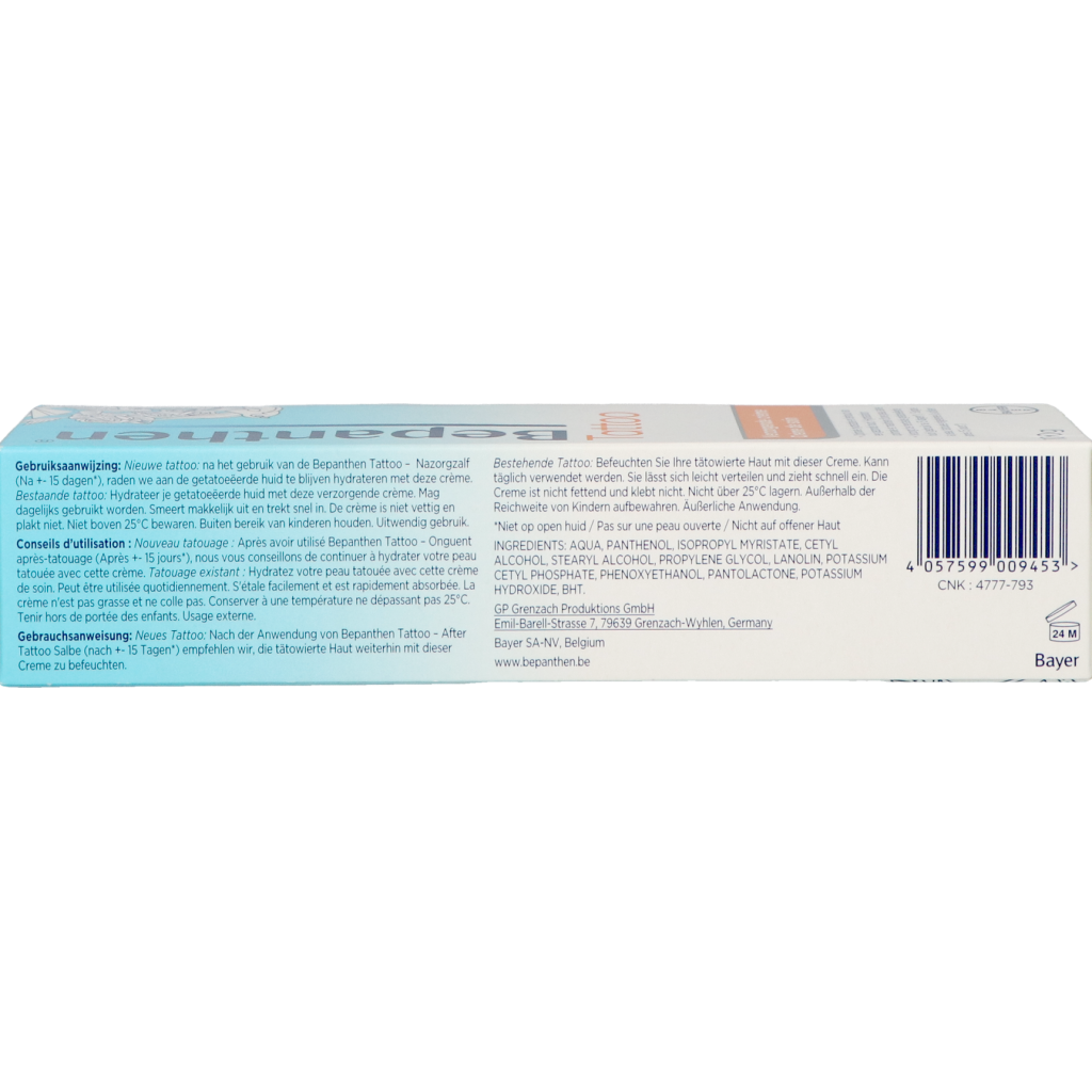 Nieuwe tattoo: na het gebruik van de Bepanthen Tattoo – Nazorg Zalf (Na +-15 dagen*), raden we aan de getatoeëerde huid te blijven hydrateren met deze crème.