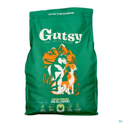 Gutsy Chicken Munchies voor puppies zijn graanvrij en ontworpen om de immuniteit te verhogen en de spijsvertering te verbeteren. Ze bestaan uit 85% dierlijke eiwitten, met insecten, zoete aardappel, wortel, appel, kip en veenbessen.