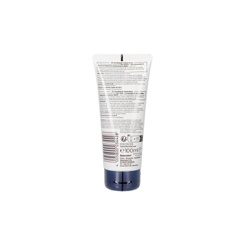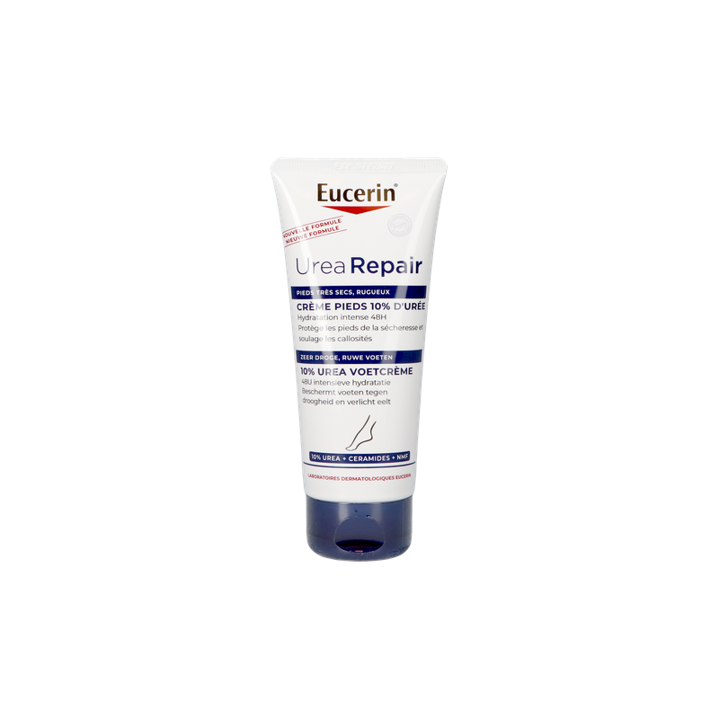Urea crème voor de droge, gebarsten huid van de voeten De huid van de voetzoelen is natuurlijk dikker en harder dan de huid van de rest van het lichaam en is bijzonder gevoelig voor uitdroging. De voeten krijgen vaak druk en wrijving van harde oppervlakken of verkeerd schoeisel te verwerken en die belasting kan de oorzaak zijn van meer uitdroging, vooral ter hoogte van de hielen. Eucerin UreaRepair PLUS 10% Urea Voetcrème geeft zeer droge en ruwe voeten de intensieve hydratatie die ze nodig hebben. De voetcrème bevat een specifieke combinatie van ingrediënten: Urea, Ceramiden en andere Natuurlijke Hydratatiefactoren (NMF's, Natural Moisturising Factors), die vocht binden en helpen de natuurlijke beschermende barrière van de huid te versterken door haar te beschermen tegen meer vochtverlies. Het is klinisch en dermatologisch bewezen dat de formule onmiddellijke verzachting geeft en intensief en langdurig hydrateert, waardoor het gevoel van uitdroging en ruwheid met tot 48 uur wordt vertraagd. De huid ziet er weer zacht uit, voelt ook zo aan, en verdikte huid en eeltplekken zijn verminderd. De voetcrème is geschikt voor alle types droge huid van de voeten, ook voor de rijpe huid en de huid met neiging tot xerose en psoriasis en mensen met diabetes. De crème kan ook worden gebruikt als aanvullende verzorging.