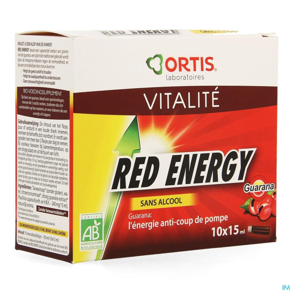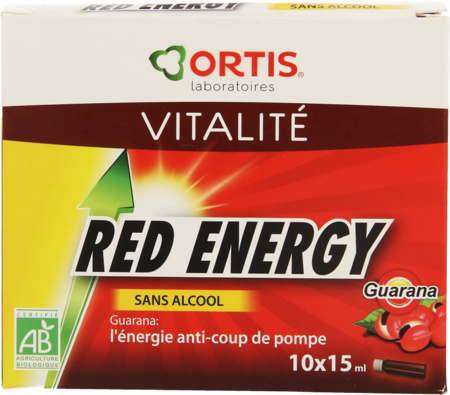 RED ENERGY zonder alcohol bevat een superactief extract van granen van de guarana, een plant die traditioneel gebruikt wordt door de Amazone-Indianen tegen de vermoeidheid, en die een onmiddellijke dosis tonus levert en: