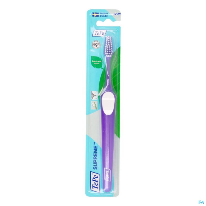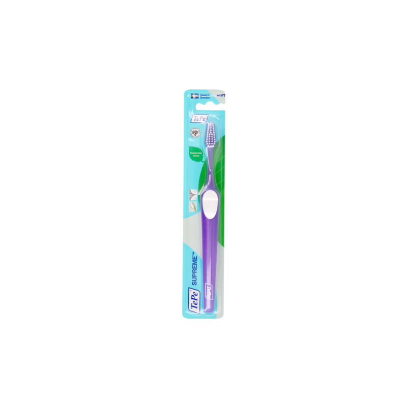 De TePe Supreme™ tandenborstel heeft borstelharen op twee niveaus. De langere borstelharen reinigen verder tussen de tanden, kiezen en langs de tandvleesrand, terwijl de kortere borstelharen de rest van de tandoppervlakken efficiënt reinigen. De Supreme tandenborstel heeft een taps toelopende borstelkop voor een betere bereikbaarheid van de achterste tanden en kiezen. Een anti-slip handvat met duimkussen. De hals van de tandenborstel kan zonder verwarmen worden gebogen.