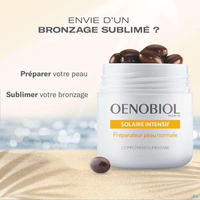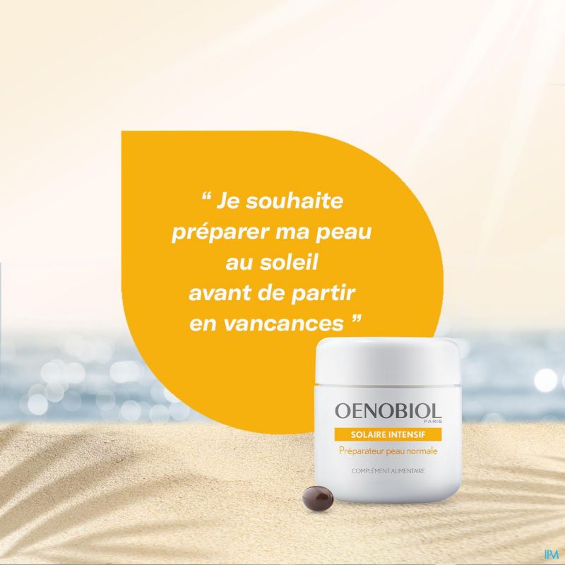 Oenobiol® Paris, 30 jaar ervaring in voedingssupplementen voor schoonheid. Oenobiol Solaire Intensif helpt je huid voor te bereiden op zonovergoten vakanties. Het is speciaal ontwikkeld voor de normale huid en bevat Actilycopene®, extract van Afrikaantje, vitamine E en selenium. Oenobiol Solaire Intensif helpt je huid voor te bereiden op de zon, sublimeert en verlengt je zongebruinde kleur.