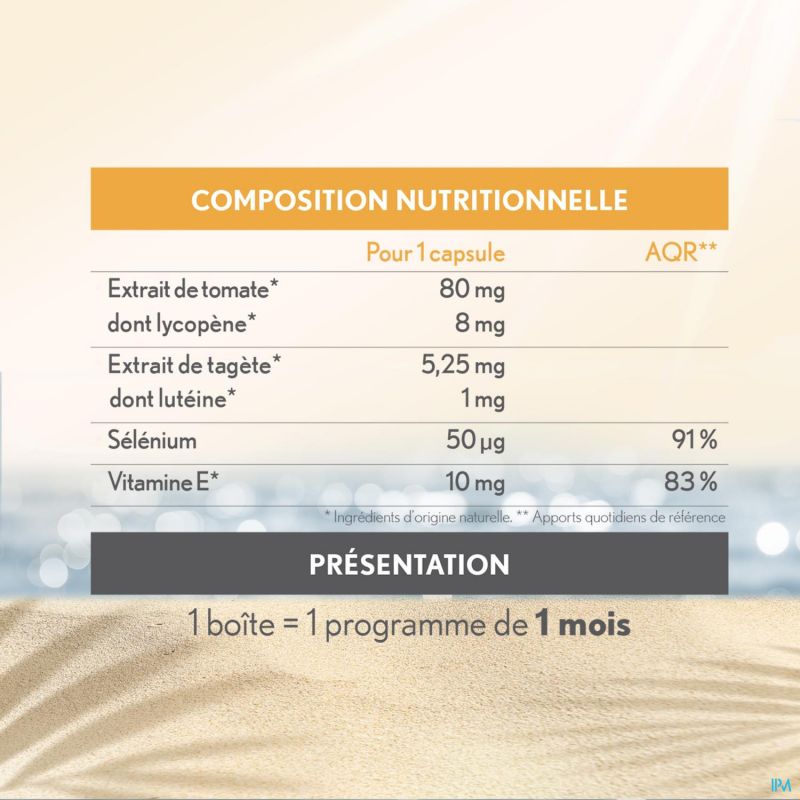 Voor 1 capsule/dag (RI*): Tomatenextract (waarvan lycopeen) 80 mg (8 mg) - Extract van het Afrikaantje 5,25 mg - Seleen 50 μg (91%) - Vitamine E van plantaardige oorsprong 10 mg (83%) *Referentie Inname